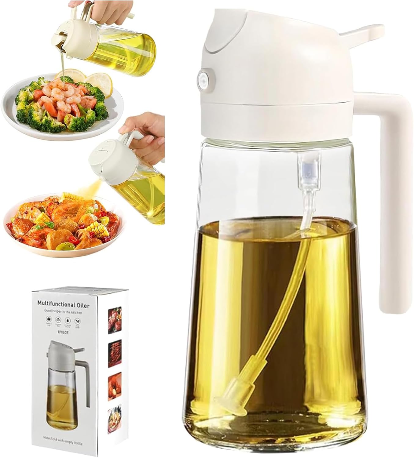 16oz/470ml Olive Oil Sprayer for Cooking – 2 in 1 Olive Oil Dispenser for Kitchen Gadgets, Air Fryer, Salad, and BBQ – White
