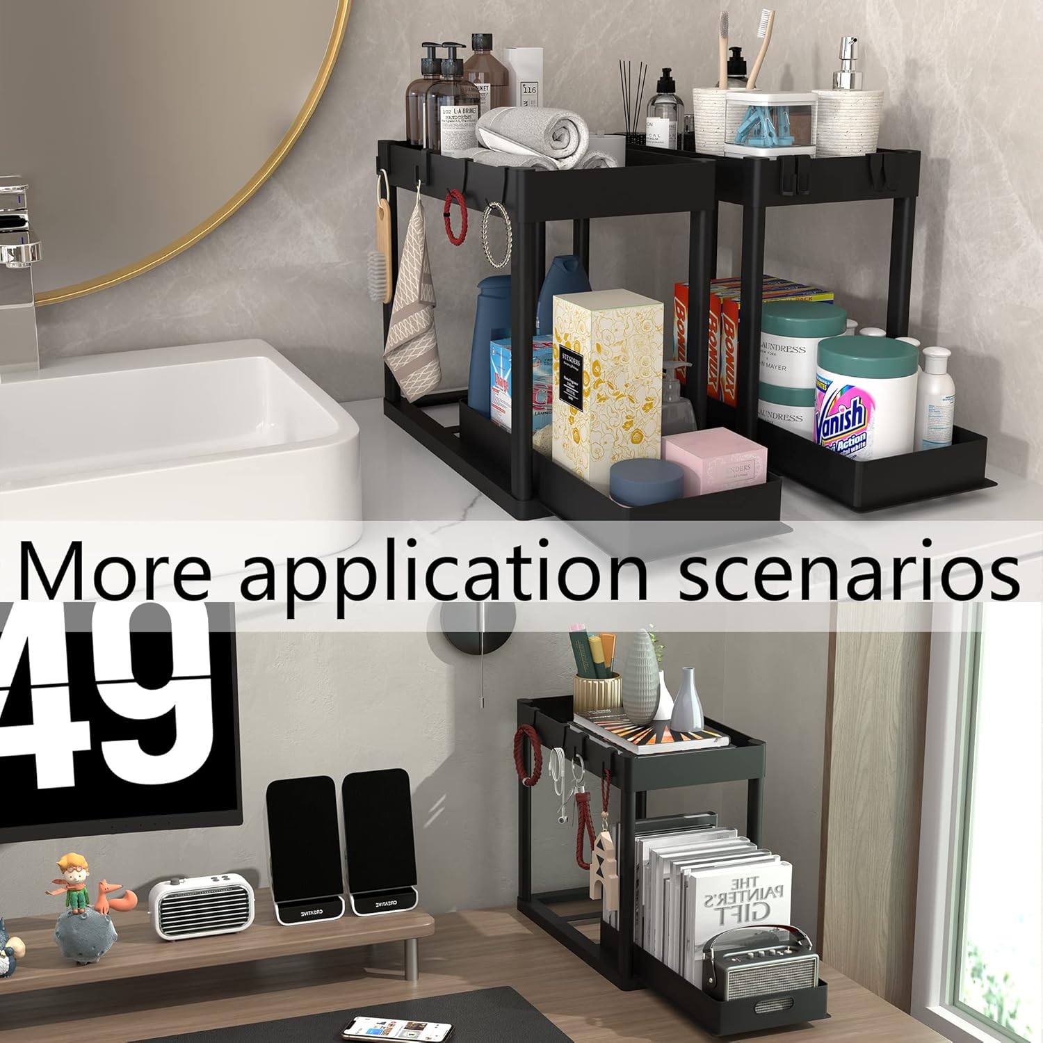 2PC Under Sink Organizer Rack 2 Tier Under Sliding Cabinet Basket Organizer Drawer with 4 Hooks, Multi-purpose Under Sink Storage for Bathroom Kitchen Desktop(Black)