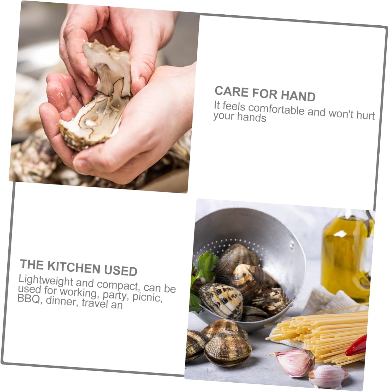 – Non-slip and ergonomic, comfortable to grip, not easy to deform and slide Oyster Shucking Clip.