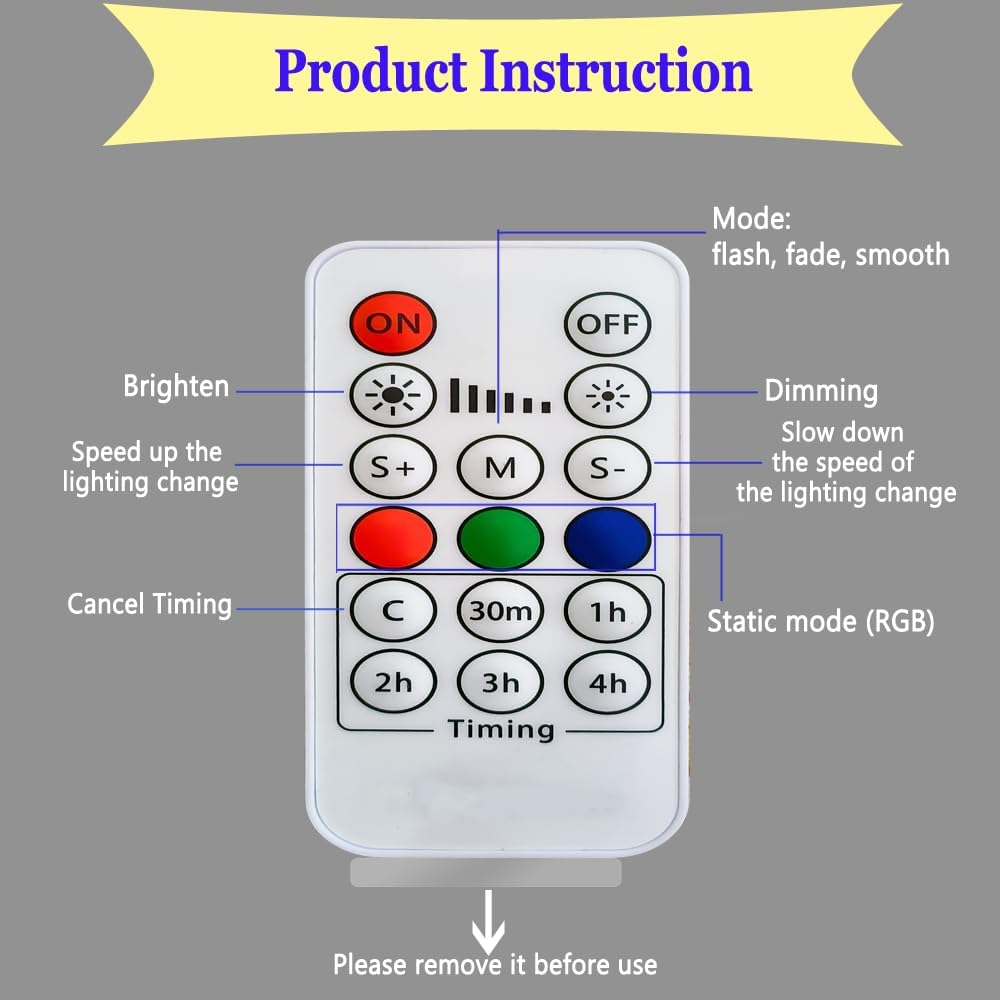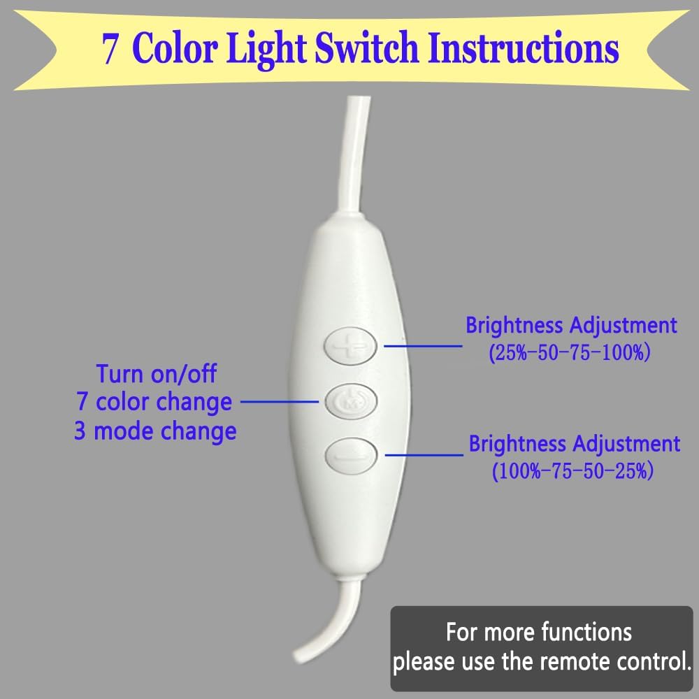 4 levels Brightness Adjustment:25%-50%-75%-100%Turn on/off7 color change:Red-Green-Blue-Yellow-Purple-Cyan-White3 mode change:Fade – Smooth – Flash