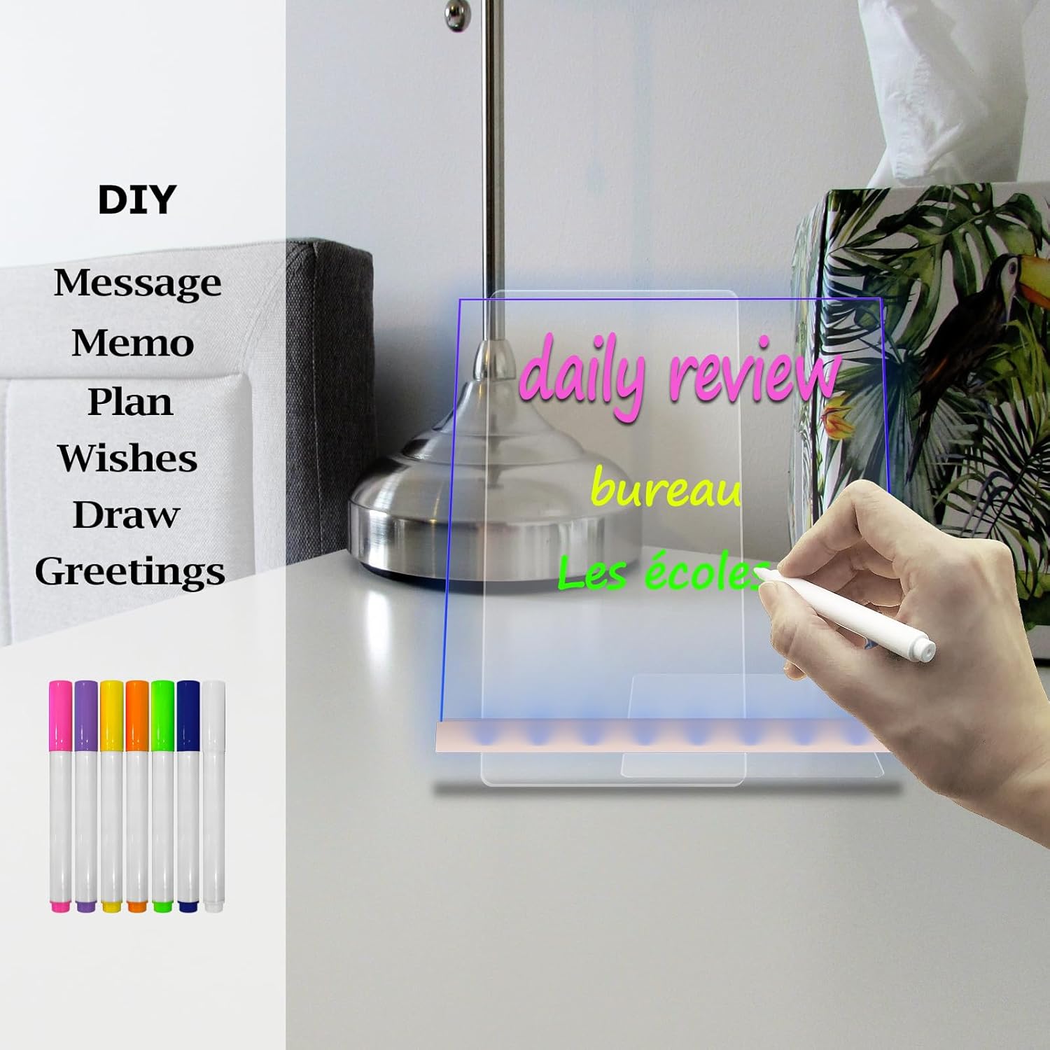 7 Color Change: Red-Green-Blue-Yellow-Purple-Cyan-WhiteThis acrylic board is made of high quality acrylic material, the board surface is smooth and transparent, and the view is clearer.The board surface has good wear resistance and corrosion resistance, sturdy and durable.The light source adopts high-quality LED, the light is soft and uniform, not dazzling, and harmless to our eyes.It is both a decorative light and a message board, record your habits and organize your life.