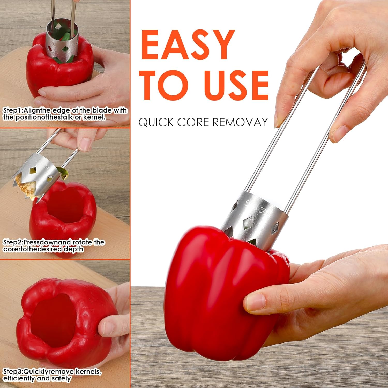 【Widely Application】Our universal stainless steel vegetable corer is not limited to bell peppers. It works wonders on other fruits like apples, pears, and pineapples as well. With a simple twist and pull, this popular kitchen gadgets 2024 efficiently eliminates stems, cores, and seeds, leaving you with perfectly prepped fruits for all your favorite recipes.