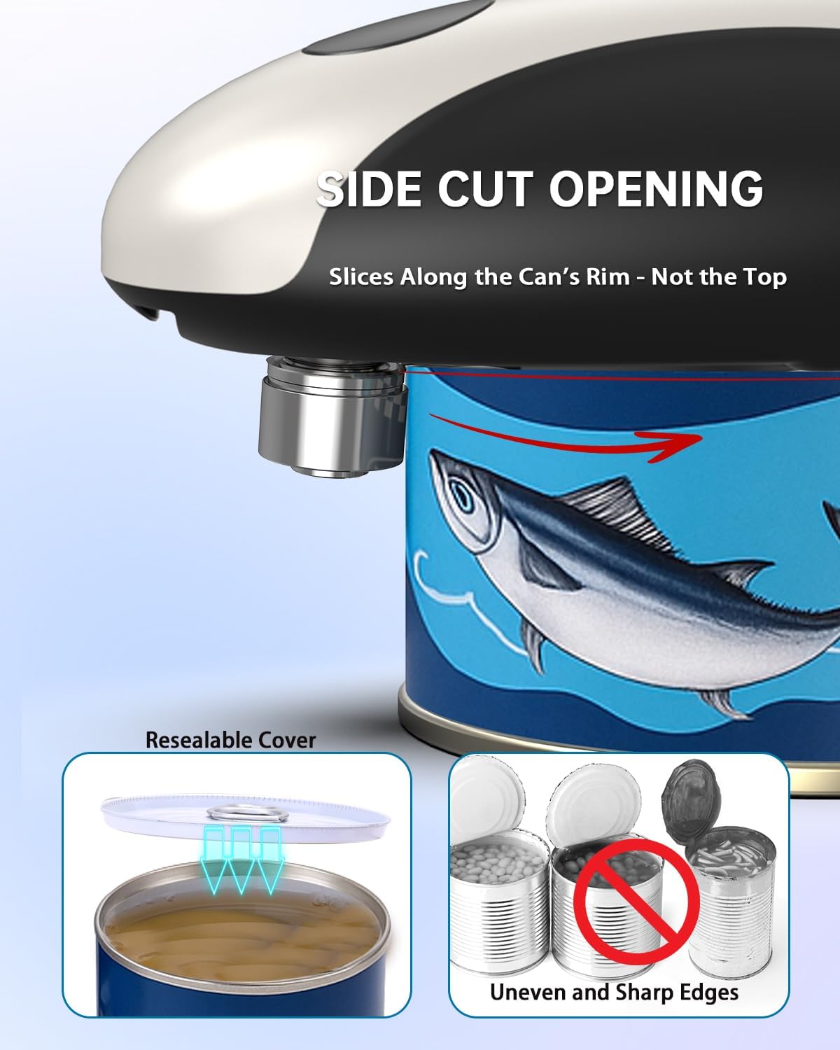 【Smooth Edge Design】No more jagged, dangerous lids! This automatic can opener uses a premium stainless steel blade that cuts cleanly along the side of the can, can opener with smooth edge, the lid stays intact for easy resealing. (Not for pull-tab or soda cans).