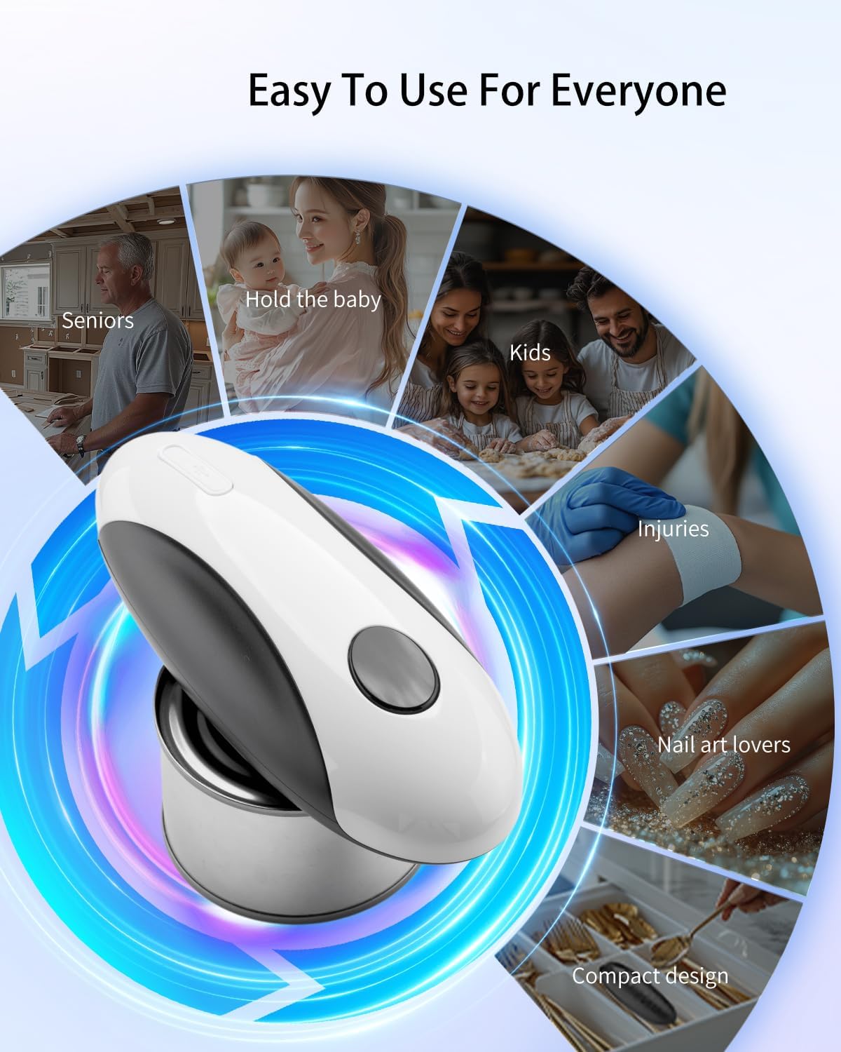 【Effortless One-Touch Operation】Say goodbye to tangling with stubborn cans! This electric can opener makes opening cans as easy as pushing a button. Simply press the start button, it will slide along the rim of the cans for a clean cut. Press the start again, wait just 2 seconds, and you’re done opening cans, is an good helper can opener for seniors.