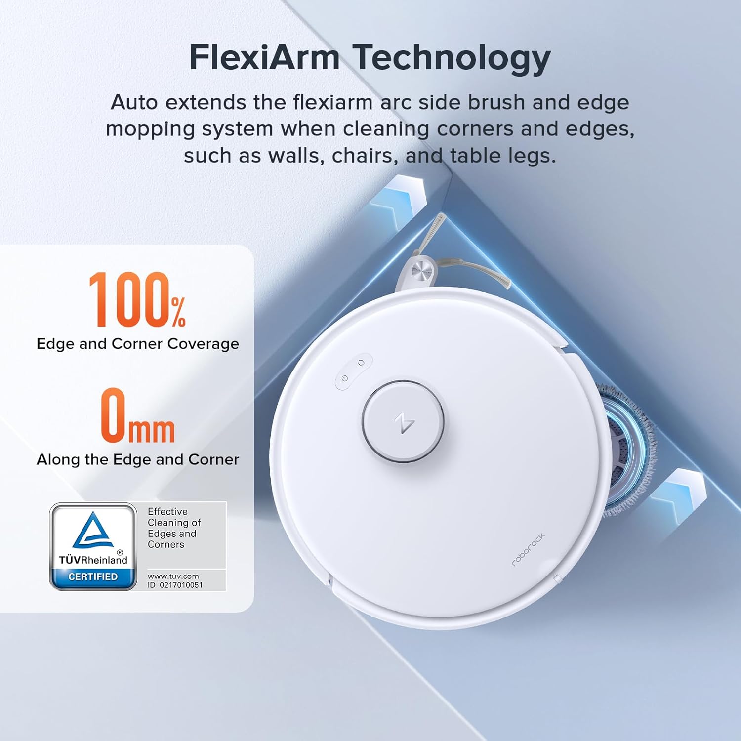 FlexiArm Side Brush & Mop: The exclusive FlexiArm Arc Side Brush and Edge Mopping System deliver exceptional cleaning coverage, eliminating blind spots and ensuring no dirt is left behind. When detecting corners, the arc side brush quickly extends to sweep away messes for thorough cleaning. And the extendable right-side mop precisely cleans along edges and adjusts dynamically to corners