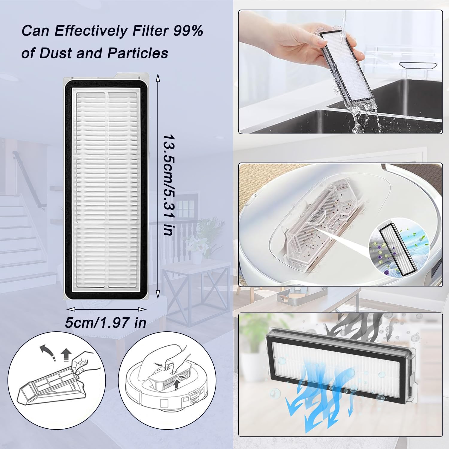 Washable HEPA Filter: The X1 HEPA filter is made from washable ABS material, which efficiently filters out dust, particles, and pet hair.