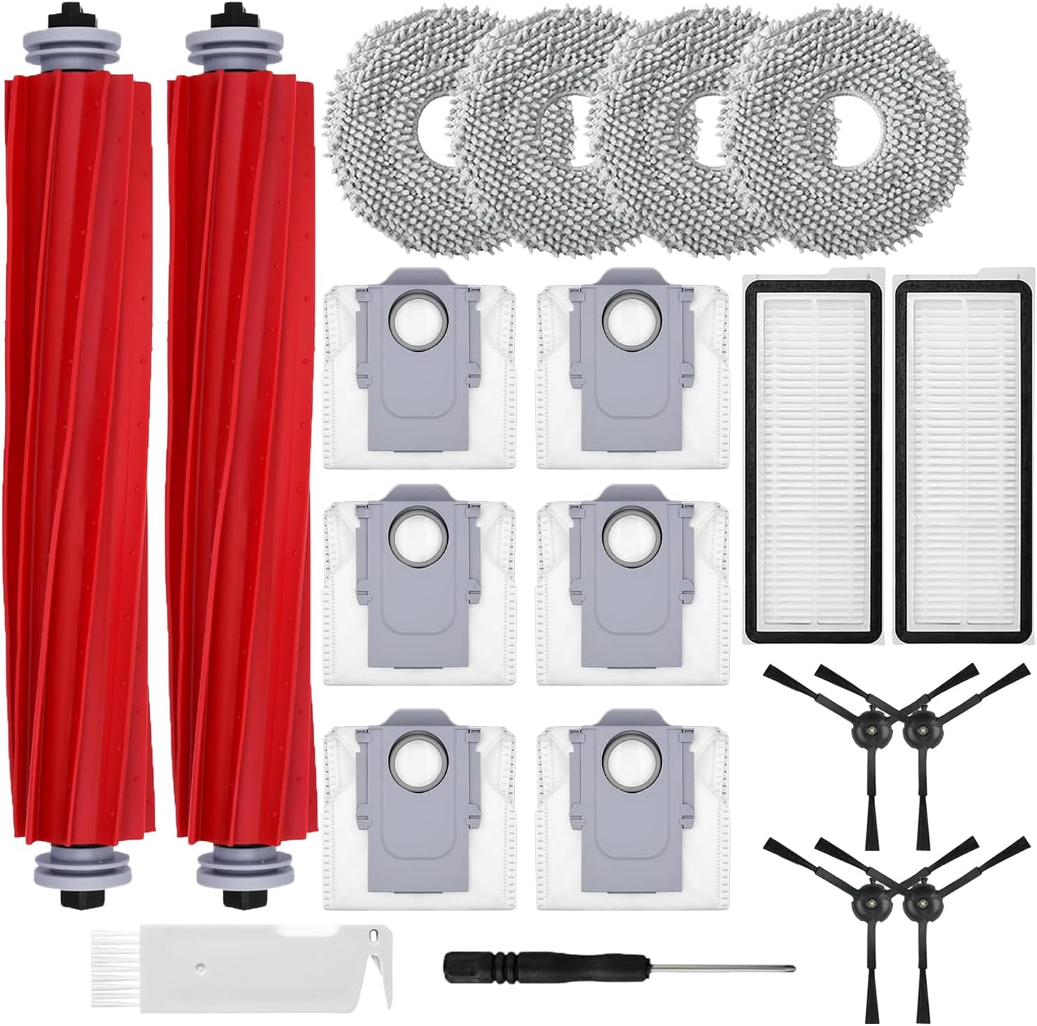 [Value-for-Set] The package includes 2 rubber main brushes, 4 mop pads, 6 dust bags, 4 side brushes (black), 2 HEPA filters, 1 cleaning brush, 1 screwdriver.