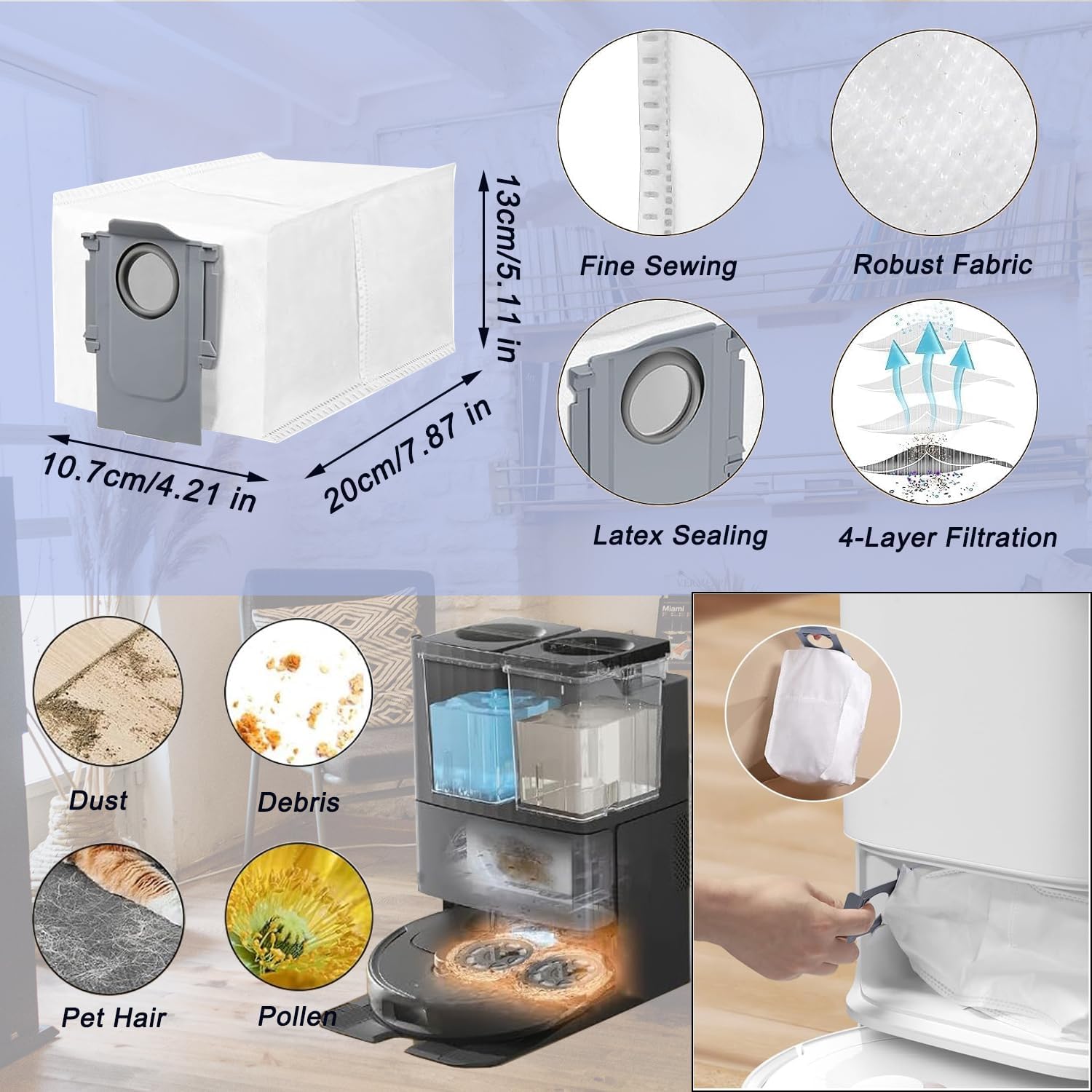 [High-quality dust bag] Our dust bag is made of high-quality melt-blown fibers and non-woven fabrics, and has a dense structure to prevent dust leakage and protect your machine. 2.7L large capacity, can hold 4-8 weeks of dust and dirt. Avoid the hassle of going to the trash frequently. It is recommended to replace the Qrevo S dust bag according to actual use.