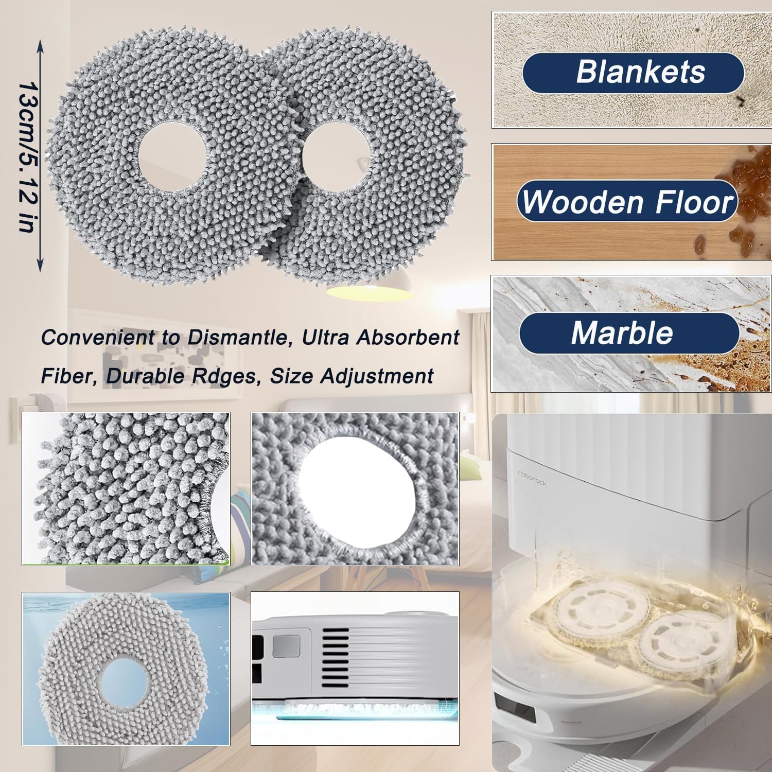 The mop pads are designed to fit snugly against edges, offering strong water absorption and even distribution. They can effectively remove stubborn stains and are highly resistant to dirt.
