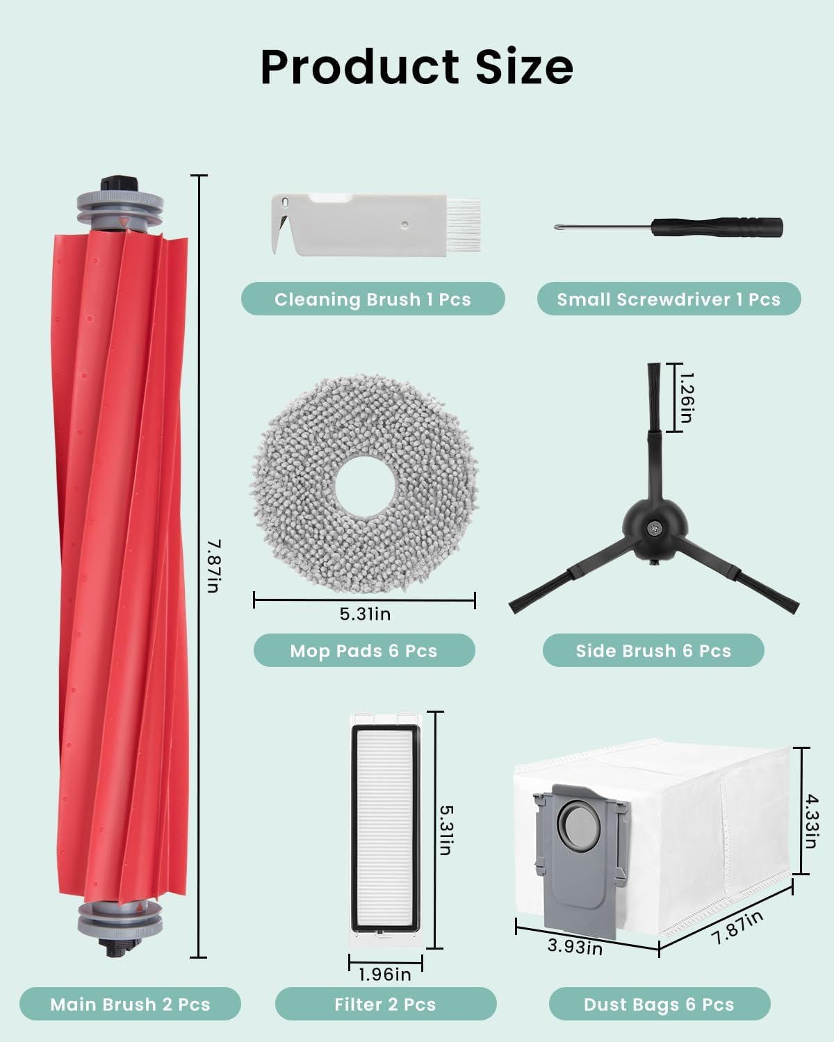 ✅Package Include: 1*Main Roller Brush, 2*HEPA Filters, 6*Sweep Side Brushes, 6*Mop Pads, 6*Vacuum Dust Bags, 1*Cleaning Tool, 1*Screwdriver.