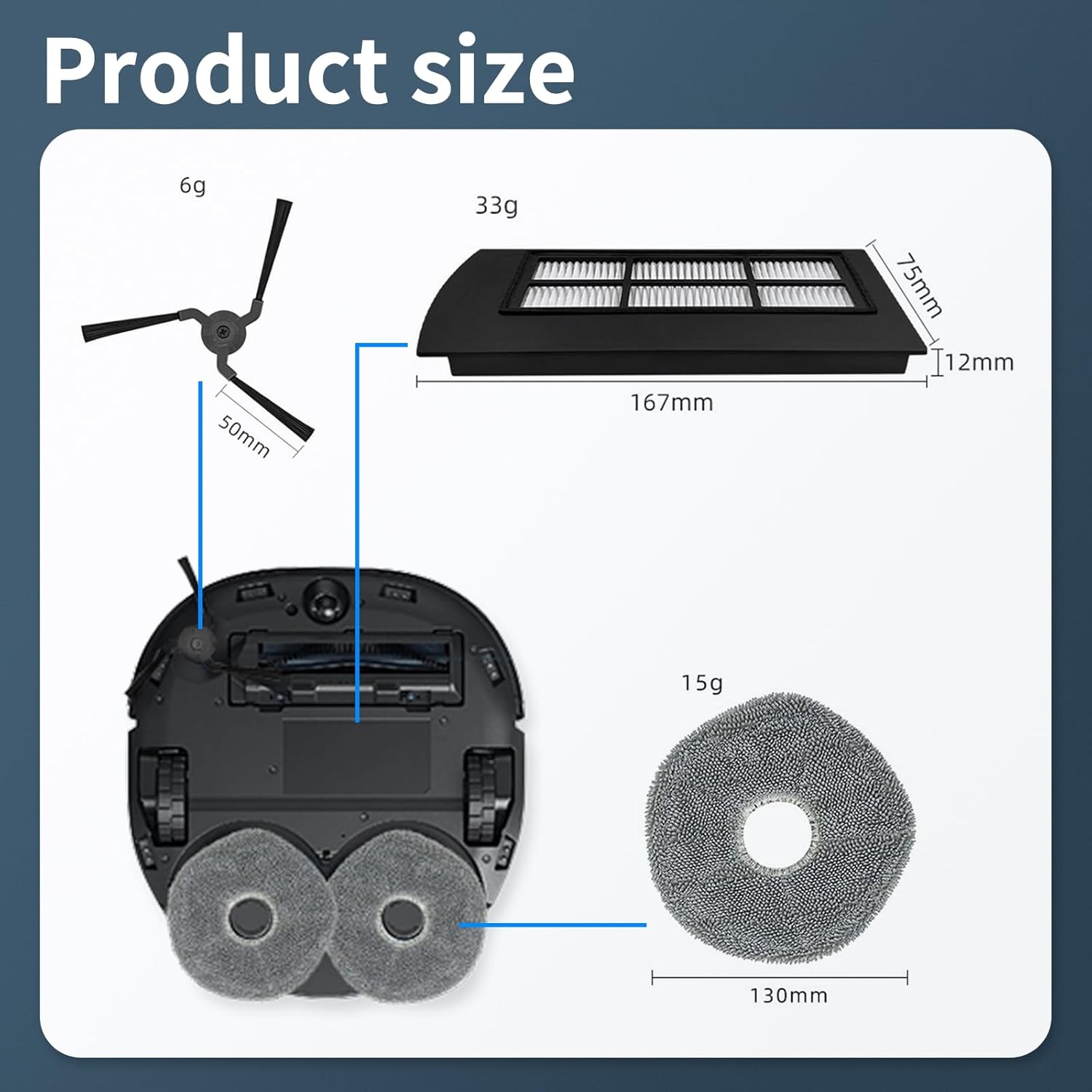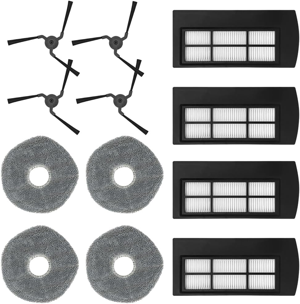Fit models Fit for EUFY X9 SERIES Robot Vacuum Replacement Accessories Color As Pictures Show Features Side brushes reach deep into corners and edges to remove more dirt, dust and debris Features HEPA filter stays clean and reduces dust from entering the air you breathe Features The soft microfibre mopping pads easily tackle stubborn stains and keep floors shiny Packing List 4×Side Brushes, 4×HEPA Filters, 4×Mop Pads