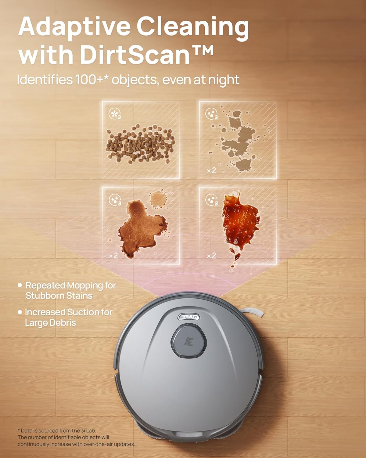 AI-Powered DirtScan: Identifies 100+ household objects and messes, even in darkness with automatic illumination, and customizes cleaning methods, from repeating mopping for tough stains to boosting suction for larger debris like pet food, all by itself!