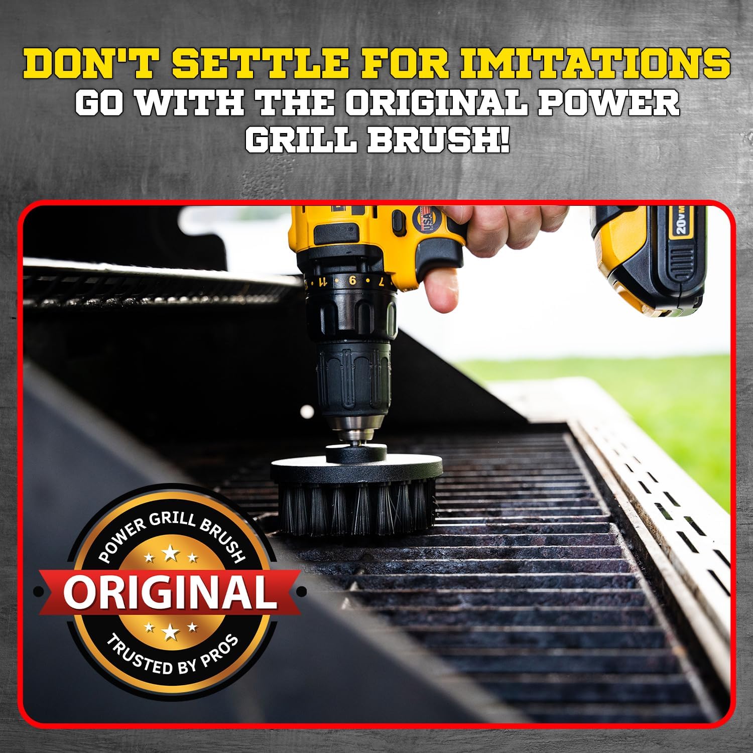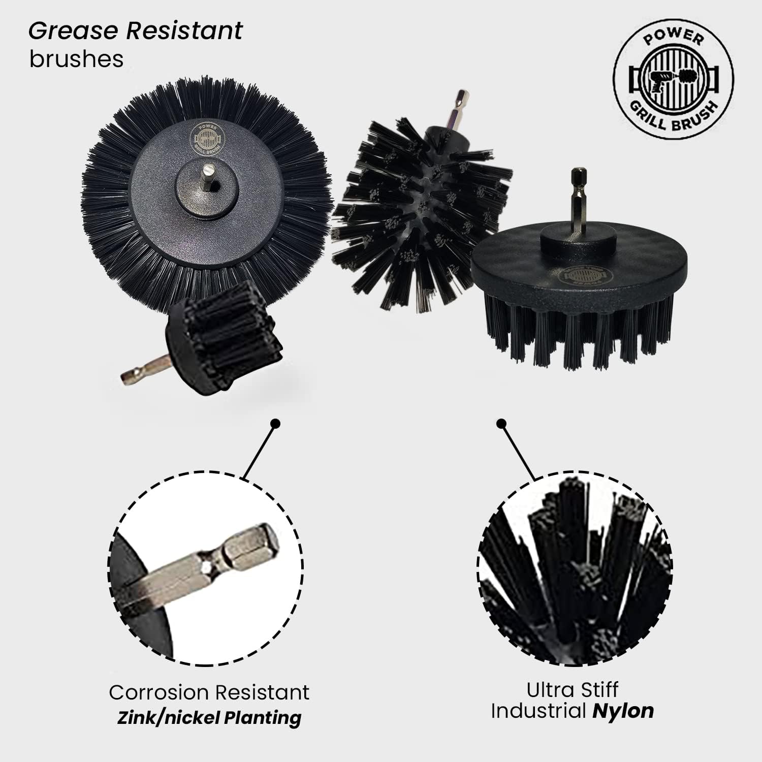 COMPLETE SET OF ROUND GRILL BRUSHES – This wireless drill brush set contains 5 accessories; 4 brushes and a drill bit extender. Two of the brushes are 2 inches in diameter, one with small bristles and one with relatively longer. There is one 5 inches and a 4 inches flat brush to clean that covers larger surface areas. All commercial grade ultra stiff nylon safe grill brushes. Bushes are ment to be used on a cool, cold grill and griddle. Power Grill Brush are very durable brush/scraper set. Power Grill Brushes will not damage your grill like metal scraper will. Rescue your cleaning routine with our complete brush set, and rescue even the toughest messes. Heavy Duty brush set ever.