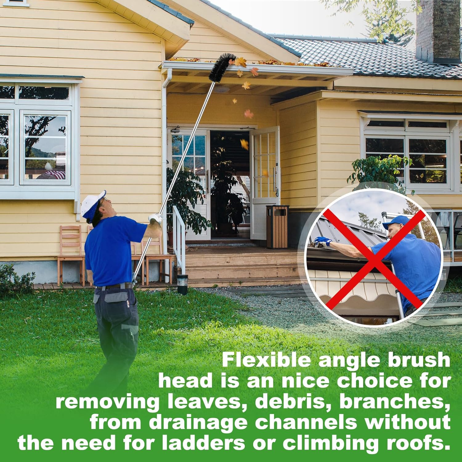 Flexible Sturdy Brush Head: Gutter guard cleaning brush features a curved angle design that allows hard brushes to enter drainage channels and quickly clean dead corners. Flexible angle brush head is an nice choice for removing leaves, debris, branches, from drainage channels without the need for ladders or climbing roofs.