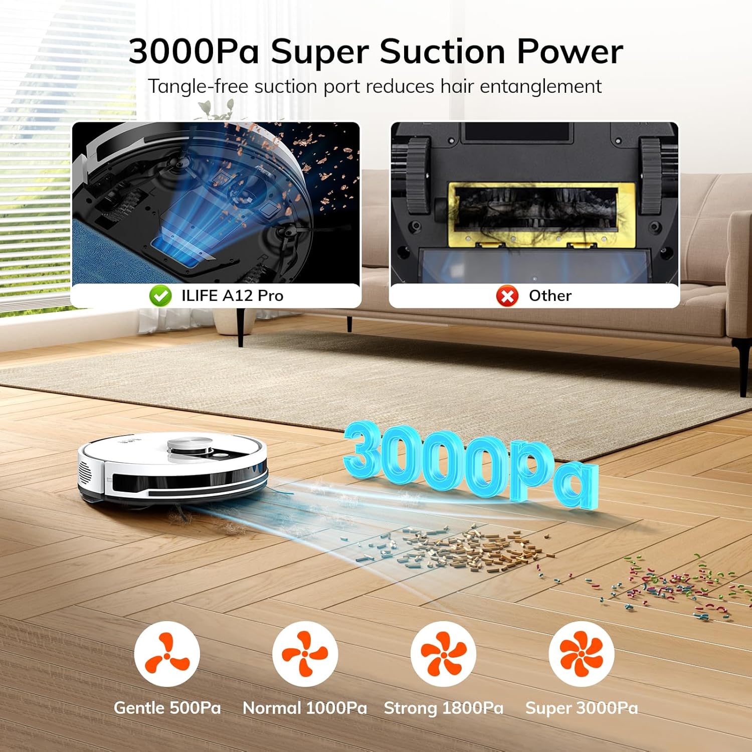 Powerful 3000Pa Suction for Deep Cleaning: With 3000Pa maximum suction power, A12 Pro robot vacuum effortlessly picks up dirt, debris and pet hair from hard floors, carpets and other surfaces. You can choose among four suction modes for cleaning: Quiet (500Pa), Standard (1000Pa), Strong (1500Pa), and Max (3000Pa)