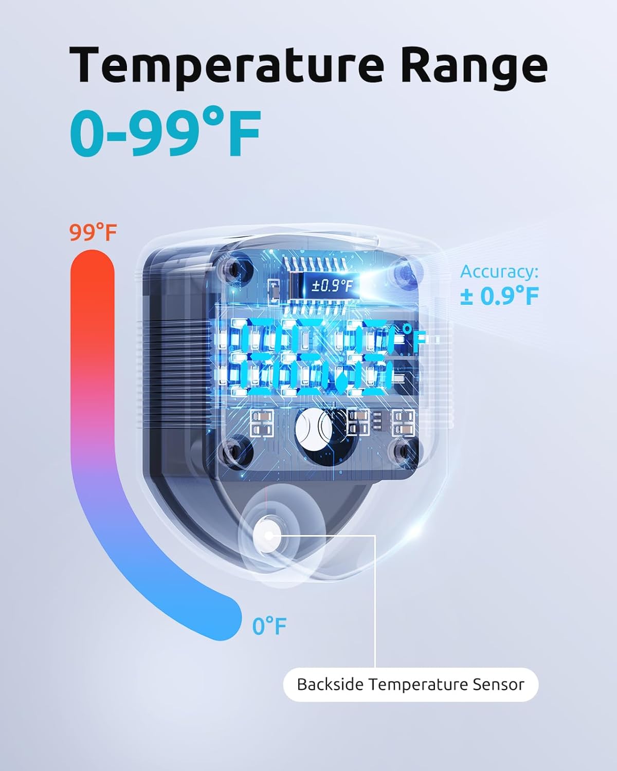 1.Accurate Temperature Monitoring: Backside is temperature sensor,press and hold for 3 seconds to switch temperature units.monitoring range from 0℉ to 99℉.Accuracy: ±0.9°F.