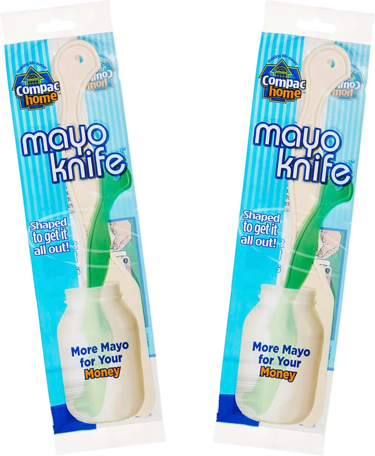 Mayo Knife has a unique shape that reaches under the lip of the jar; on the sides; and in the corners of containers; works for mayonnaise and other condiments; useful kitchen accessories