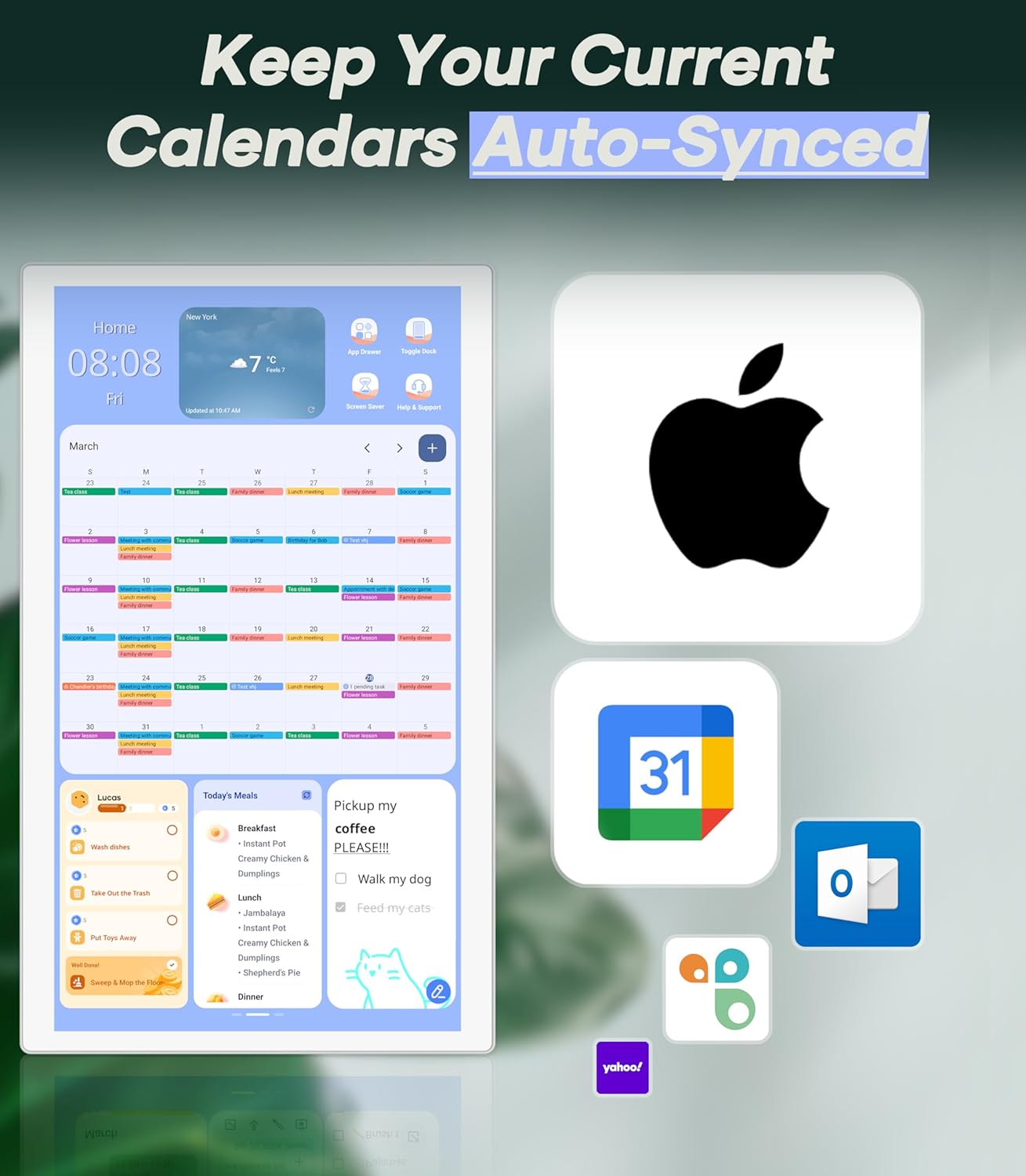 Seamless Syncs Family Calendars: Our electronic calendar for family syncs effortlessly with all calendar apps like Apple Calendar, Google Calendar, and Outlook. Keep your family organized and on track by sharing, viewing, and editing schedules together on one screen.