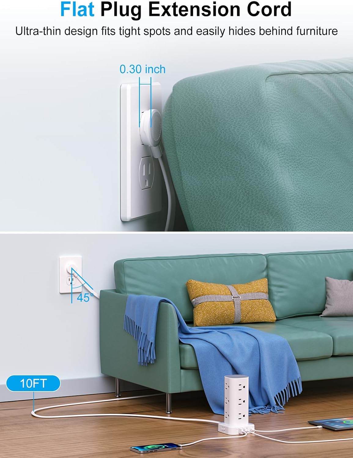 Flat Plug Power Strip & 10 FT Extension Cord: With a mere 0.30-inch ultra-thin flat-head plug design, this power strip sits flush against the wall and effortlessly fits into tight spaces behind sofas, nightstands, bookshelves, and headboards. The 45° right angle design creates an extra space for other plugs below without blocking. With a 10FT extension cord that’s long enough to give you the freedom to use it anywhere – homes, offices, or college dorm rooms