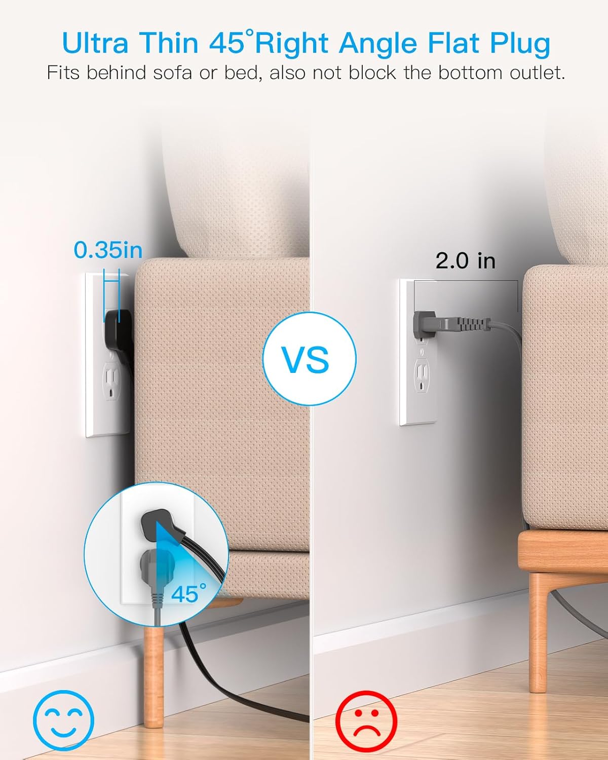【Ultra Slim Flat Plug Power Strip】With only 0.35 inch ultra thin plug and 45° right angle design, which can close to the wall easily, and hide in the back of furniture, bed or refrigerator