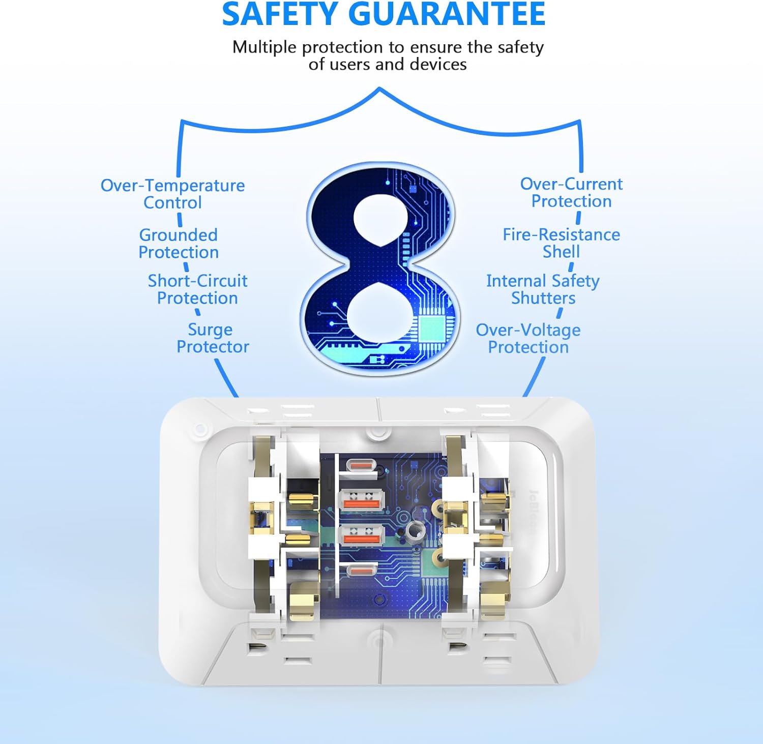 【Wall Plugs with USB Ports】The extra plug wall outlet features 2 USB-A ports and 2 USB-C port. Each USB port features 5V/2.4A Max output. Built-in smart technology, detecting charging devices and delivering optimal charging speed automatically, compatible with most USB devices. NOTE: The UCB-C port doesn’t support any other devices which need 14~22V charging voltage.
