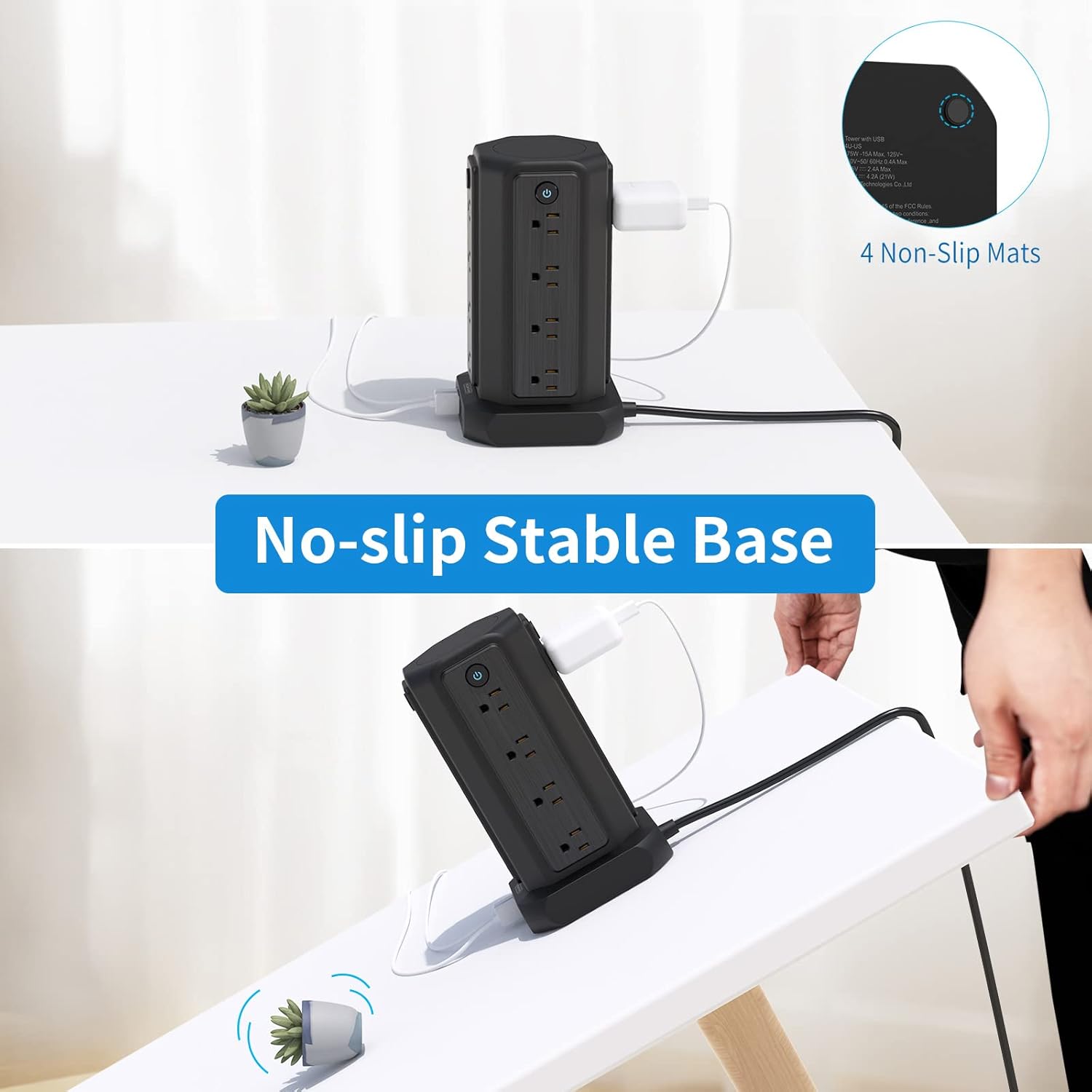 Soft Silicon Non-Slip mats added at the bottom to make the power strip apply to all kinds of desktop closely adhered, in case of scratching and sliding.The Base is very stable. We use geometry to design a sturdy base that can withstand the device plugs without worrying that the plugs are too heavy for the tower to stand upright.