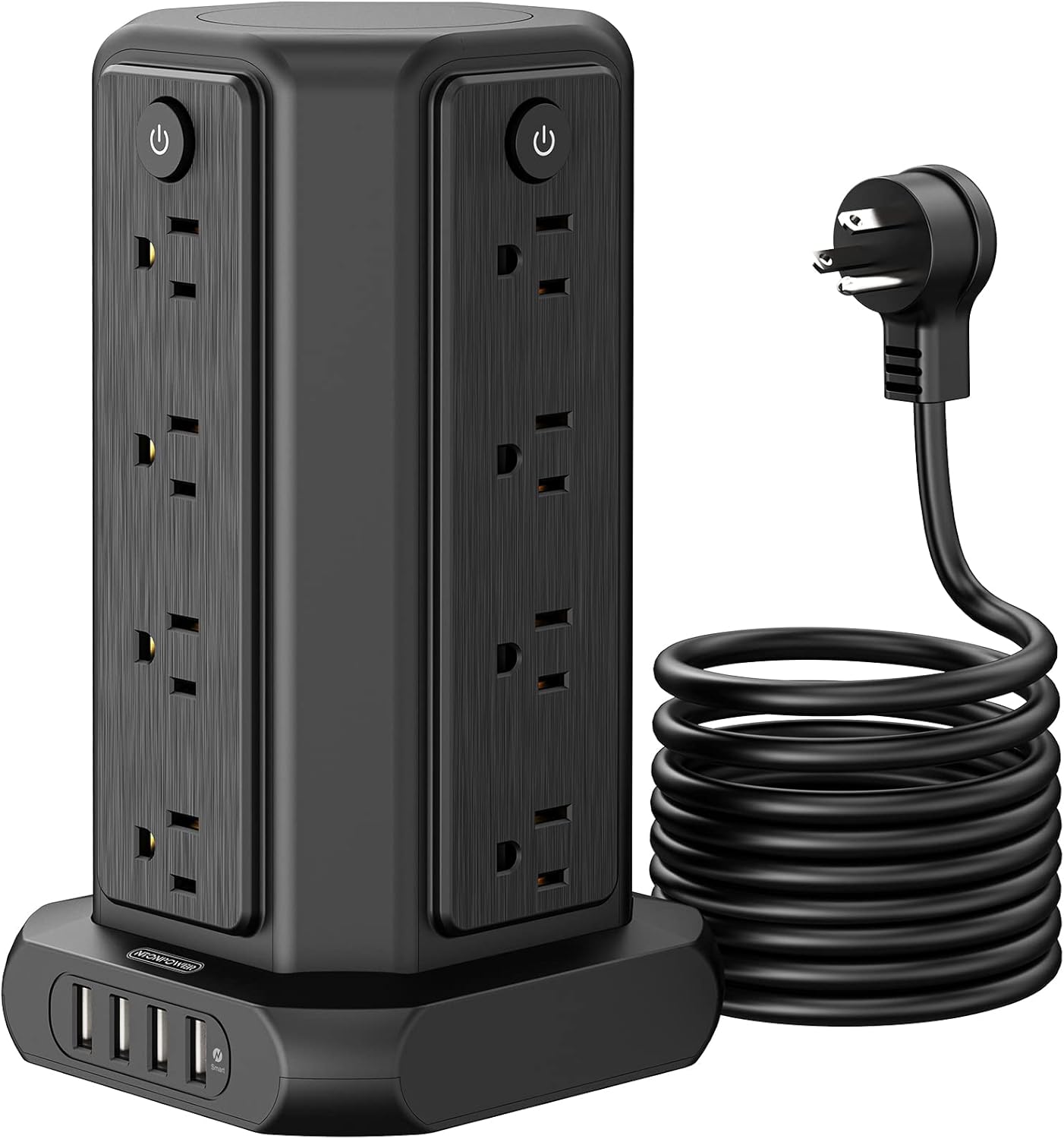 【Flat Plug Power Strip Tower with 10 FT Power Cord】:The right-angle plug easily fits in tight spaces like behind furniture, bookshelves, desks, or anything close, moving furniture closer to the wall without bending the cord. The 45-degree angled plug does not block the bottom outlet of the wall socket. The 10ft extension cable is flexible enough that you can reach the distant socket.