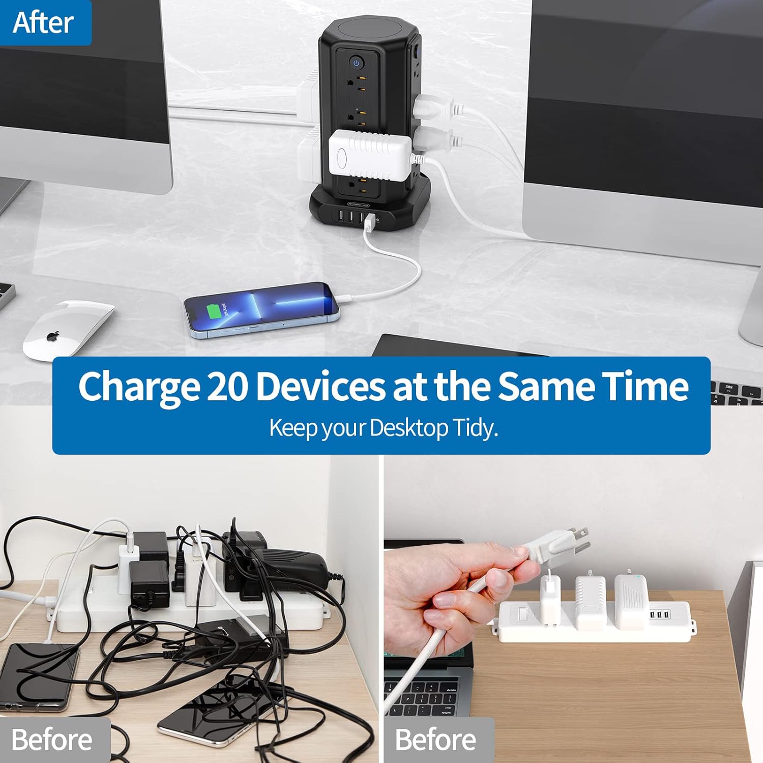 We often find that there are not enough sockets are available or the big plug blocked other outlets! But we and our family, friends have mobile phones, laptops, kindle and many devices that need to be charged.20-IN-1 Power Strip Tower – Ideal for Desktop, Nightstand, Home, Office, Kitchen, Bedroom, Dorm Room & More