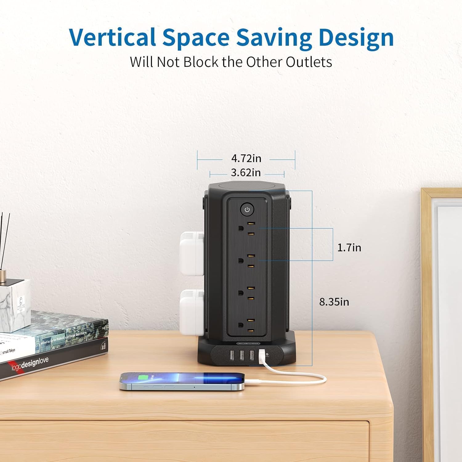 Enough space between outlets: With the tower design, you can use the normal sized plugs or the larger sized ones, none will block the other AC outlets.Independent switches: Each layer has an independent switch for saving energy.The separate control design of the USB port allows you to save energy when you fall asleep at night and avoid the light from affecting your sleep, while the USB can continue to charge your device continuously.Safety ensured: With the overload protection, surge protection (1080J), over current protection, short-circuit protection, over-voltage protection, it will protect your devices from multiple dimensions.Wide application: The AC outlets can charge multiple appliances such as computers, laptops, printers, and scanners. It can be used at home, in the office, or in other places.