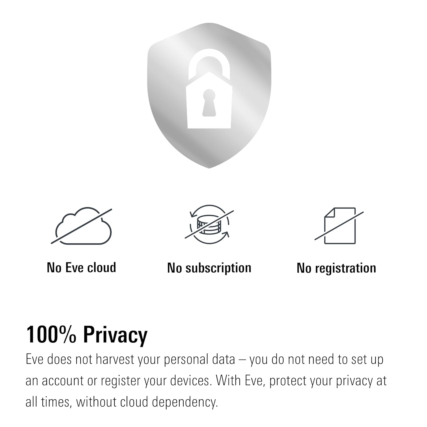 100% Privacy: No Eve cloud, no registration, no tracking. Local communication without cloud dependency.