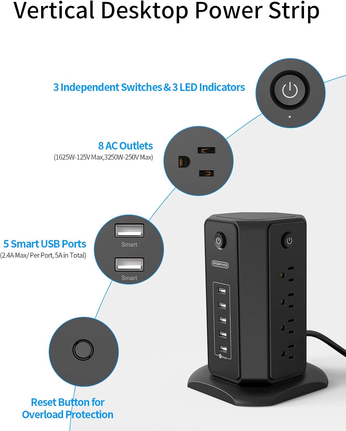 【Multi Outlets Power Strip Tower with USB】 – This power strip tower with usb equipped up to 8 AC outlets (1625W-125V Max,3250W-250V Max) and 5 fast charging usb port (Maximum 2.4 A output per port), smart IC auto-adjust charging rate, allow you to charge 3 iPads and 2 iPhones at the same time. Meet all your charging needs for home and office.