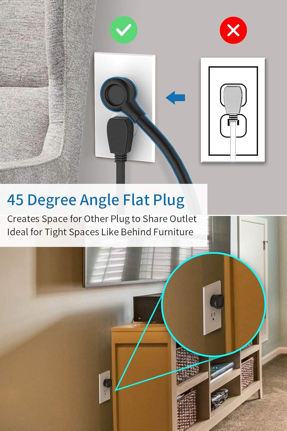 The flat plug features a low profile fit in tight spaces easily, and the 45 degrees angled plug does not cover other outlets.