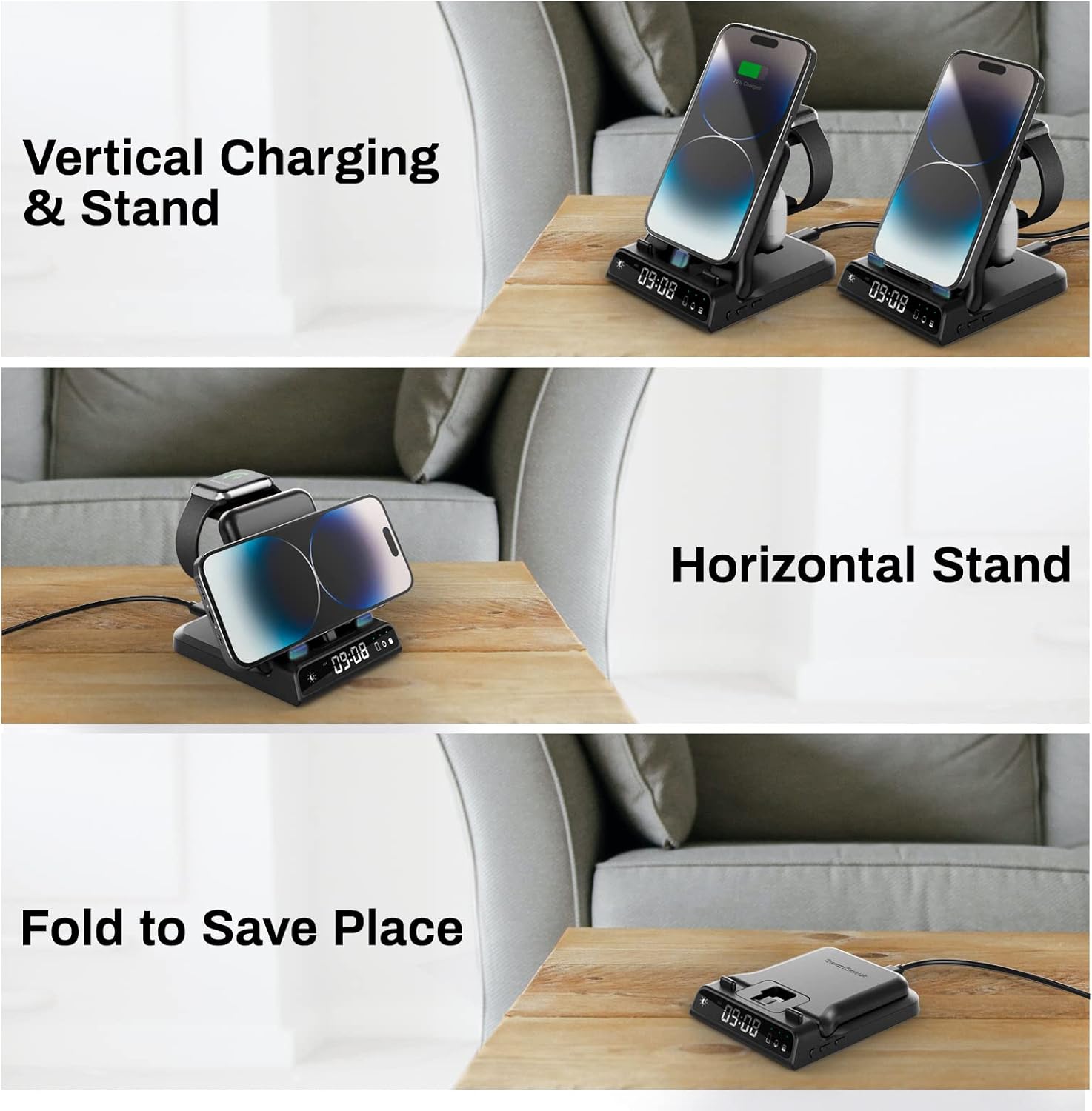 Portable Design – Foldable and compact, it fits easily in a desk corner, backpack, or luggage. Unfolded, it sturdily holds and charges your phone, watch, and earbuds