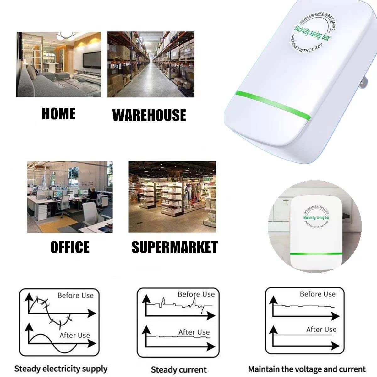 [Application scope]The electricity saving box, an electricity killer, can be used in households, offices, shops, restaurants, residences, apartments, hotels, factories, etc. It has advantages in air conditioners, refrigerators, washing machines, water pumps, electric stoves, microwave ovens, electric ovens, electric kettles, etc.and can prevent electric overheating under rated load. However, for some very small appliances, such as electric fans and LED bulbs, there is no benefit.