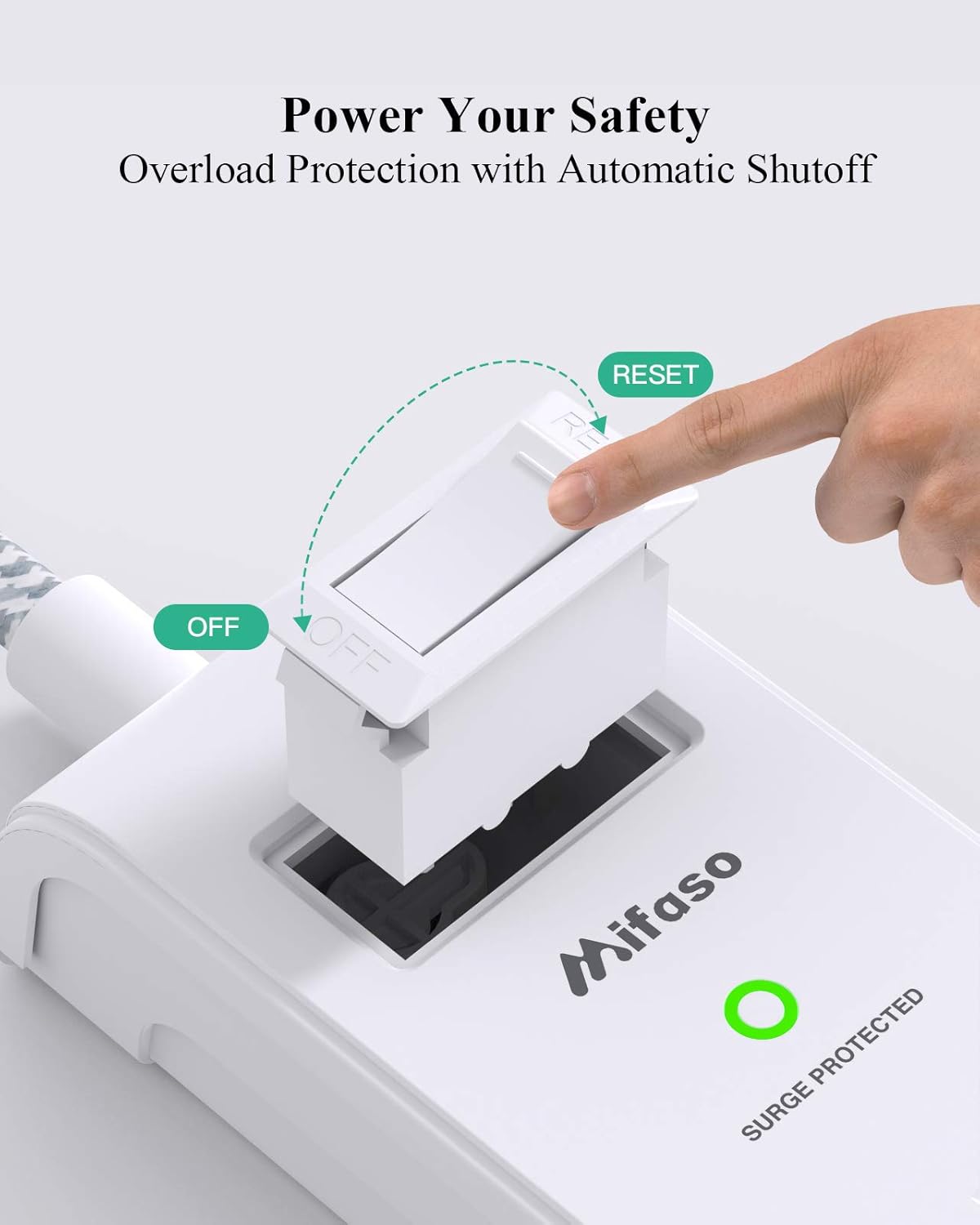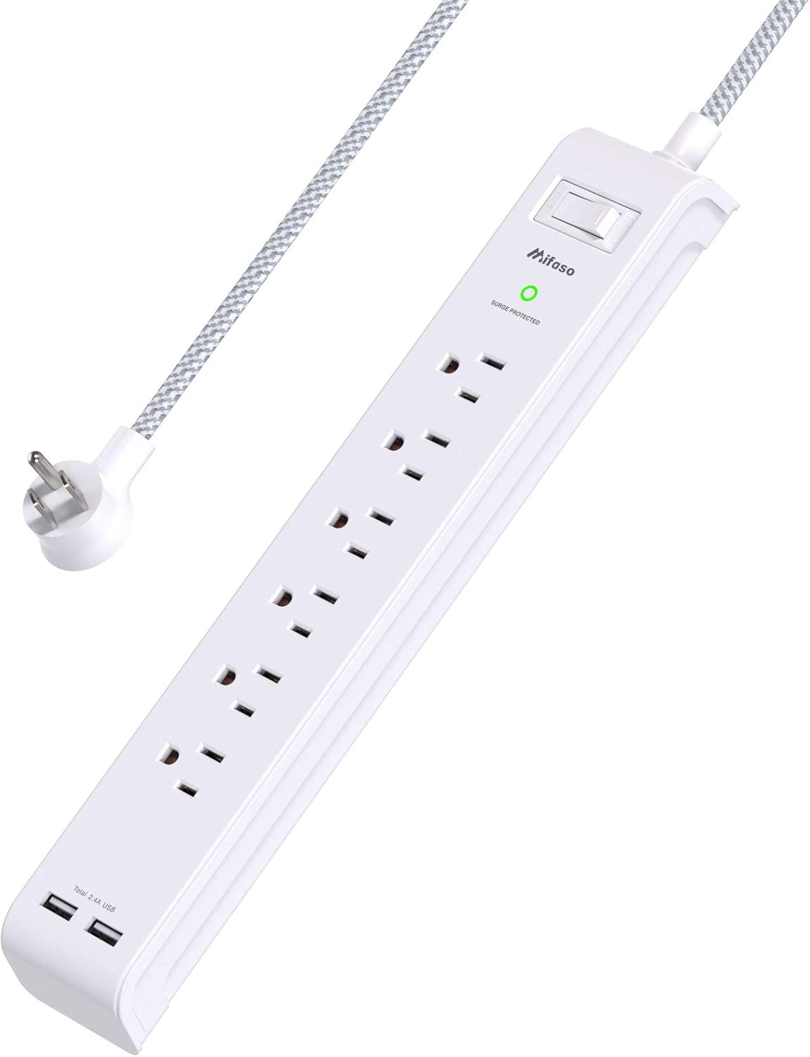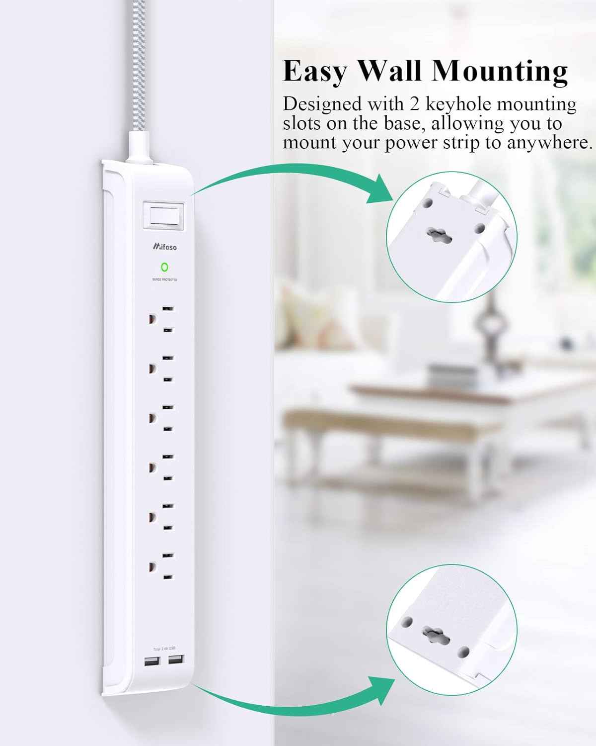 Mifaso 6-Outlet Surge Protector Power Strip with 2 USB Ports. With 12ft heavy-duty extension cord and 45° flat plug, it makes a compact, handy desktop charging station for your home or office workstation. The included keyhole slots on this extension cord make it a breeze to mount to a wall, desk, workbench or counter. Provide a sturdy base for your centralized powering station by simply attaching your extension cord where you need it most.