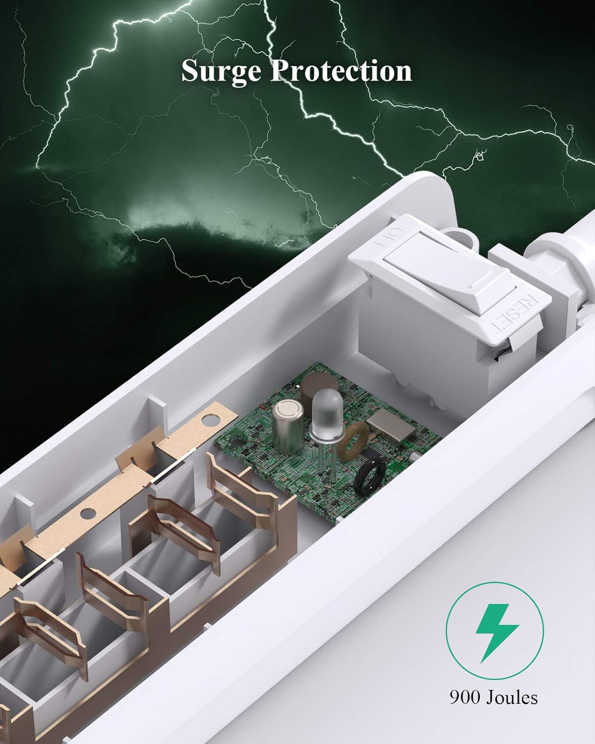【Overload Protection】- Surge protector with overload protection protects against spikes and fluctuations. The minimum energy-absorbing capacity of 900 Joules. Lighted on/off switch with an integrated circuit breaker for overload protection of all outlets.