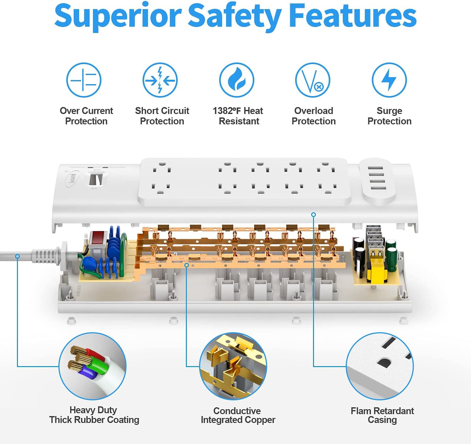 Safety and Certificate– ETL Listed and FCC Certificated. Lighted on/off switch with integrated circuit breaker for overload protection of all outlets, so it will not get hot during usage. Environmental protection and fire-resistance PC shell with flame retardant at 1382℉ makes it more durable and longer lifetime.