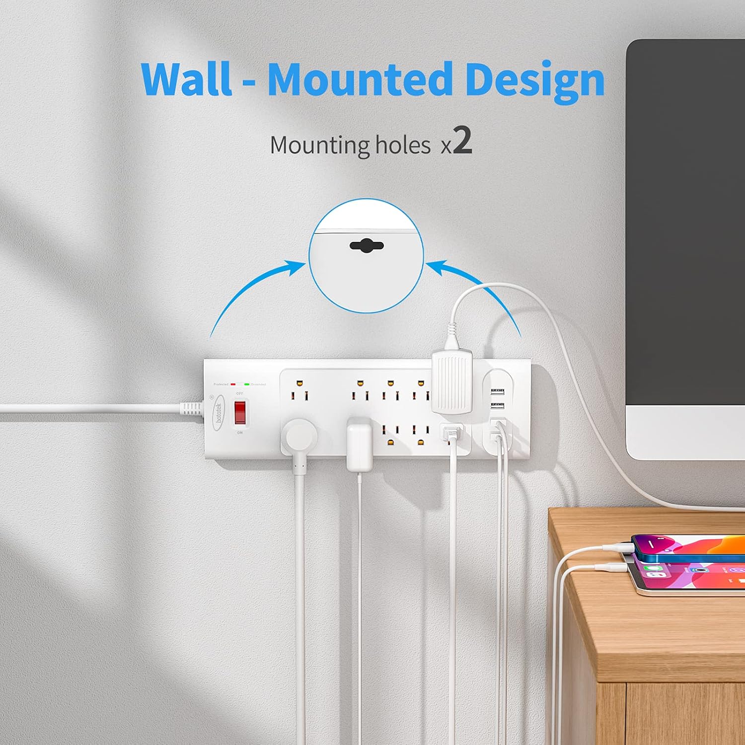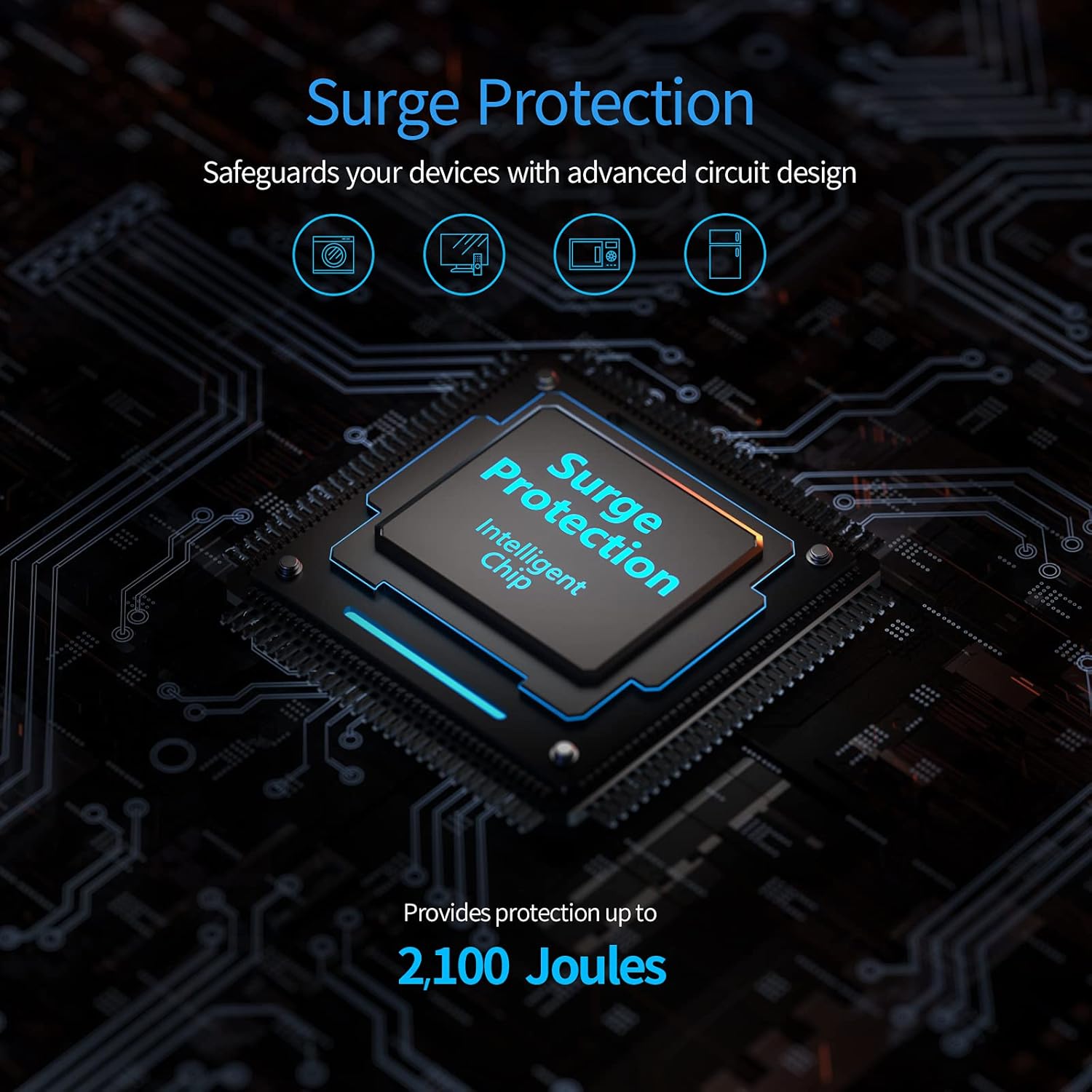 Surge Protector Power Strip with usb –3 complementary Surge Protection Circuits, TVS(transient voltage suppressor) MOV(metal oxide varistor) GDT(gas discharge tube), with the minimum energy-absorbing capacity of 2100 Joules, much more quickly and reliably than the traditional MOV surge protector circuit. (“SURGE PROTECTED” indicator light on to show your devices are protected)ight on to show your devices are protected)
