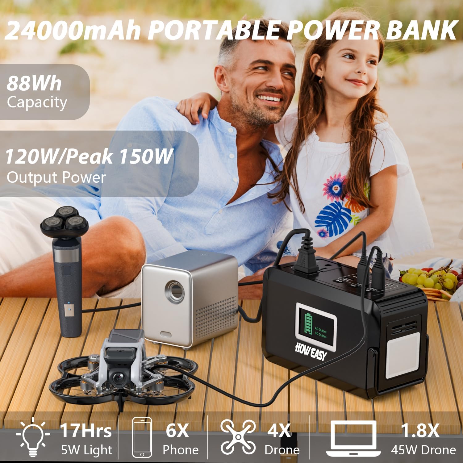 High Capacity & power bank:The portable charger is equipped with an 88Wh (24000mAh, 3.7V) rechargeable battery pack and is equipped with a 2x 110V/120W (peak 150W) AC outlet. It is a great solution for AC power, providing you with the stable and safe power you expect. This is a great choice for mobile offices, hurricane emergency supplies, RV camping accessories, road trip essentials