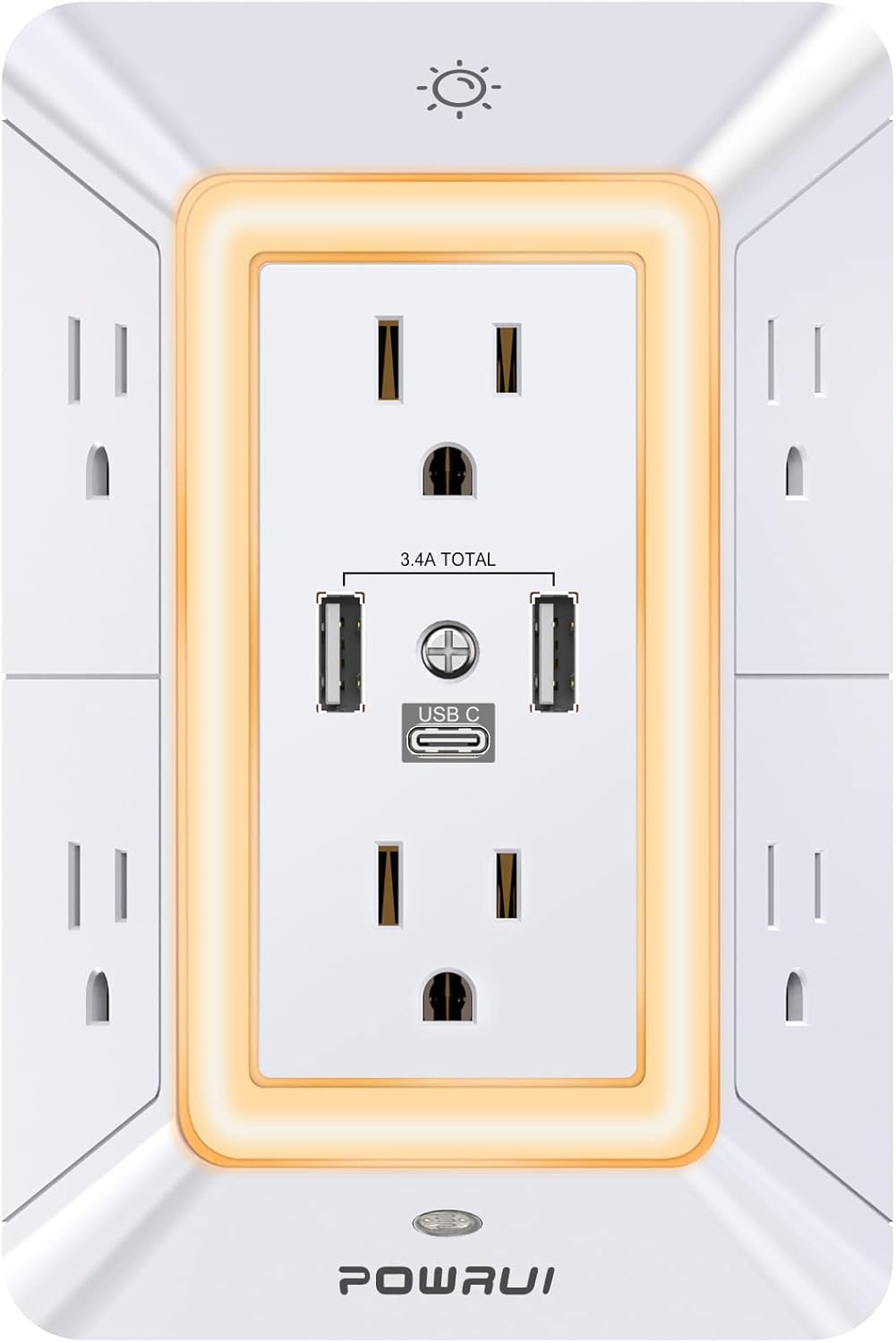 【Multi-function USB Wall Outlet】: 3 USB fast charging ports(1 USB C Port), 3-sided Power Strip, with 6 Adapter Spaced Outlets, and LED night light around the edges. Taking the place of a standard socket, but instead offering you many more plugs. Can be used in any room or public areas indoor. Save space with unique 3D design.NOTE: The UCB-C port doesn’t support any other devices which need 14~22V charging voltage.