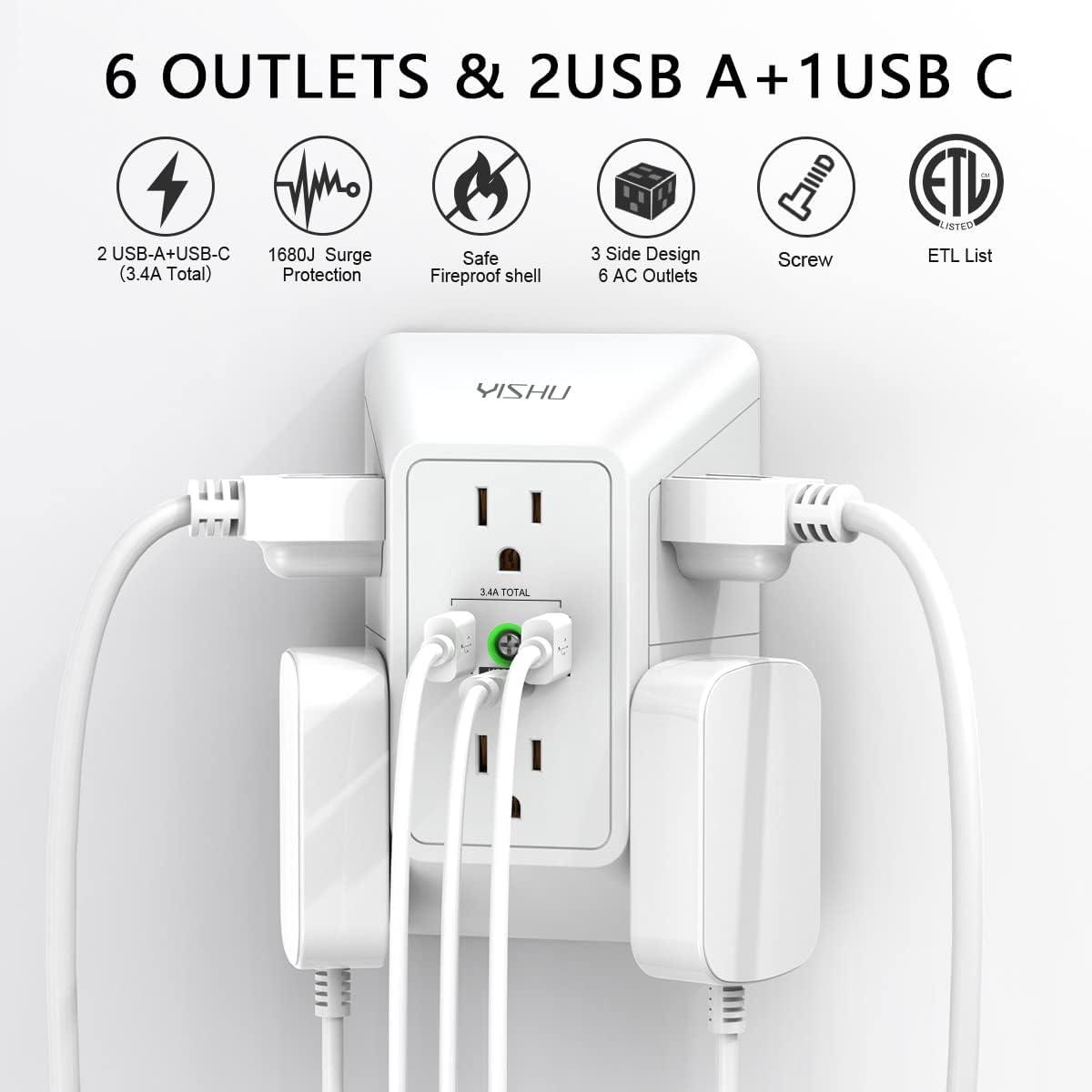 YISHU 3 Sided Power Strip Surge Protector with 6 AC Outlet Extender and 3 USB Ports