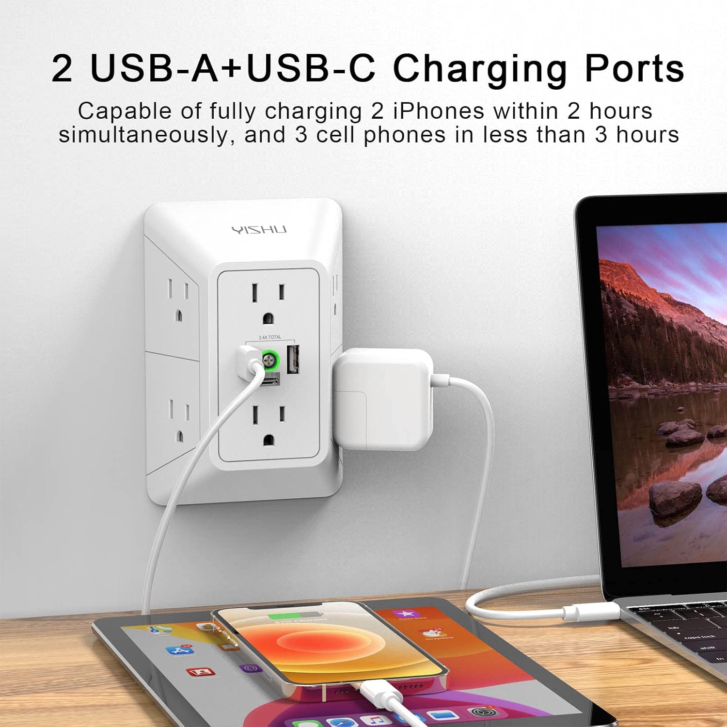 6 AC Outlet Extender 2 USB A & 1 USB C Smart Charging Ports 2.2 inches Wide Space AC Outlet 2 Level Complementary Surge Protector Circuit Product Dimensions: 5.5*3.86*2.6 inches