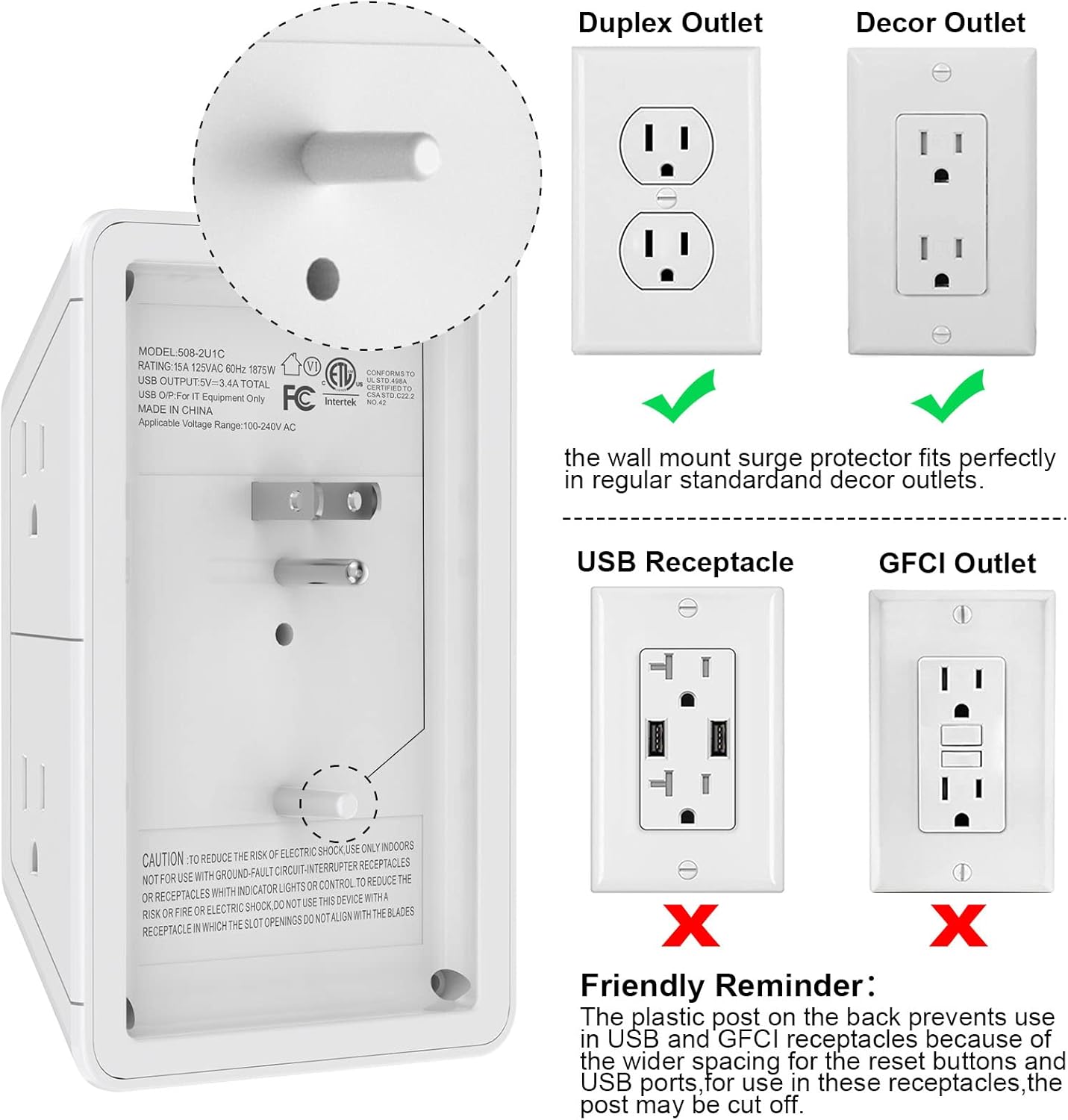 【Multi-function USB Wall Outlet】: 3 USB Fast Charging Ports(1 USB C Port), 3-sided Power Strip with 6 Adapter Spaced Outlets, Taking the place of a standard socket, but instead offering you many more plugs. Can be used in any room or public areas indoor. Save space with unique 3D design.