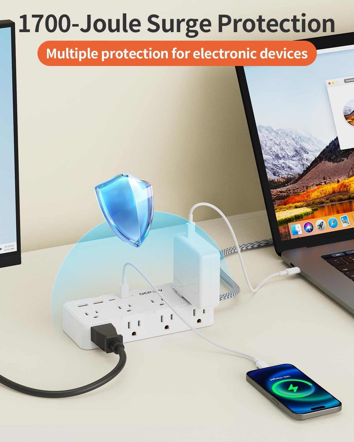 【1700J Surge Protection】: Equipped with 1700 joules surge protection, this power strip safeguards your electronics from lightning strikes and power surges, Even if you forget to unplug it when you’re out and about, you’ll have peace of mind.