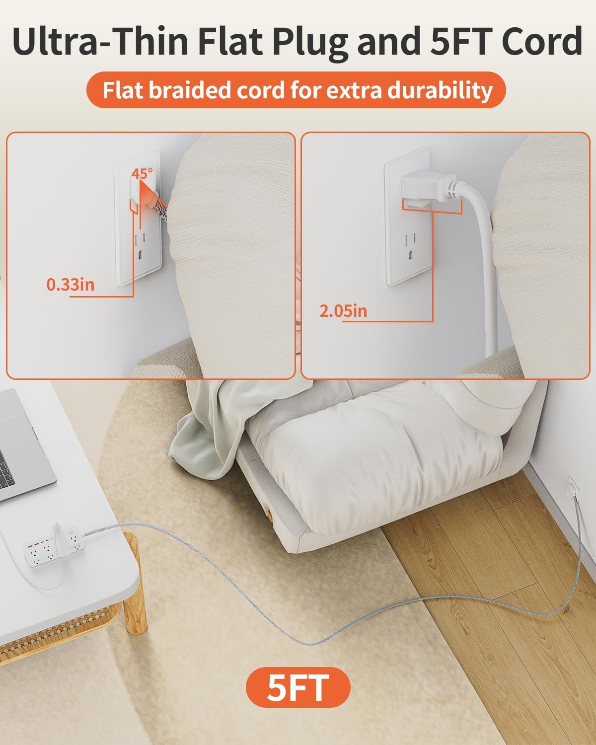 【Ultra Thin Flat Plug】: The 0.33in ultra-thin flat plug design allows you to easily plug in this power strip even behind furniture or in tight spaces, while the 5FT braided cord provides added durability and flexibilit.