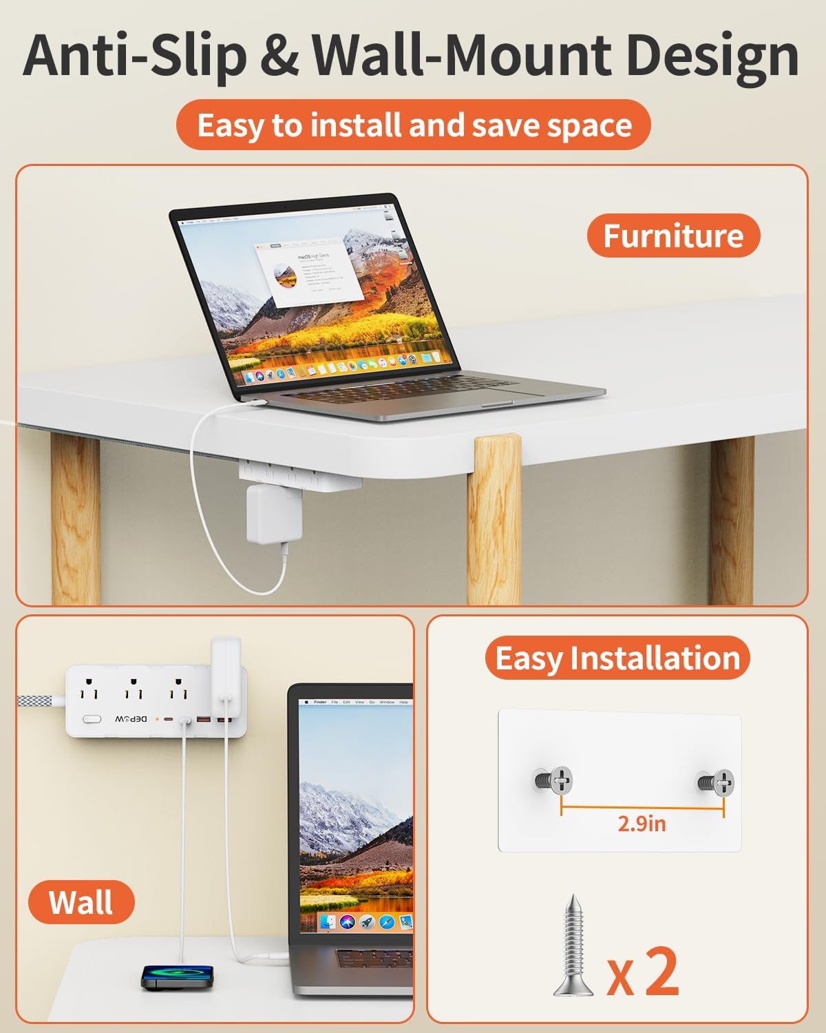 【Space-saving Design】: The 2-sided 1.7in space-saving design of this power strip allows you to easily accommodate bulky plugs without blocking adjacent outlets. Comes with 2 screws for easy installation, allowing you to mount it on walls or other surfaces to save space.