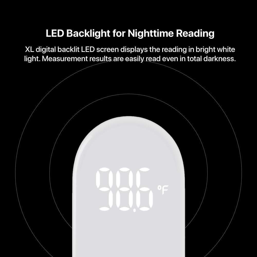 Simple, Fast, Clear, And Quiet: With an intuitive single-button control design, the thermometer reads and shows the temperature in just one second on its easy-to-read, extra-large LED display, even in total darkness. When the temperature is read, the device gives a gentle vibration notification to the holding hand—no beeps or buzzes.