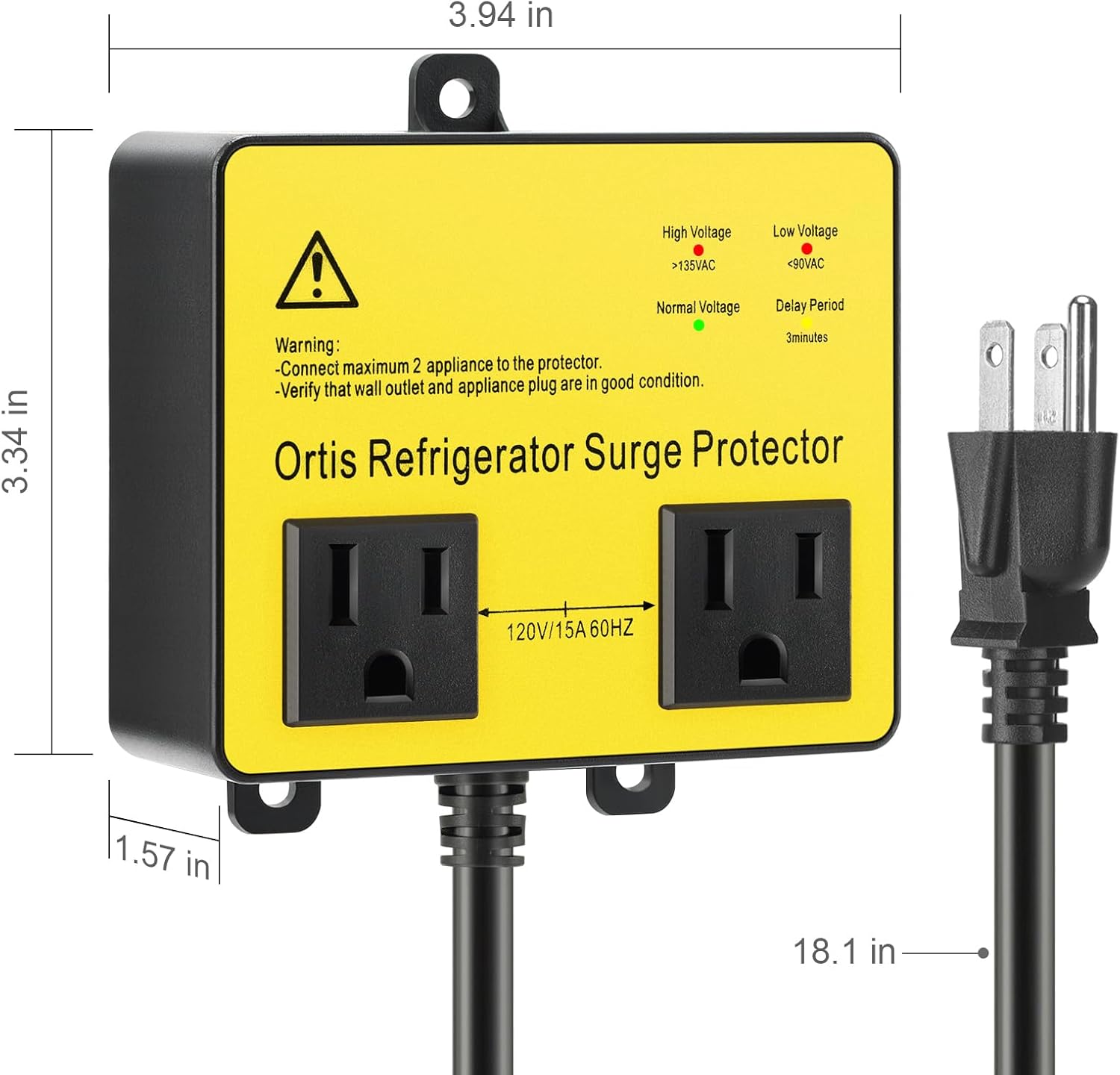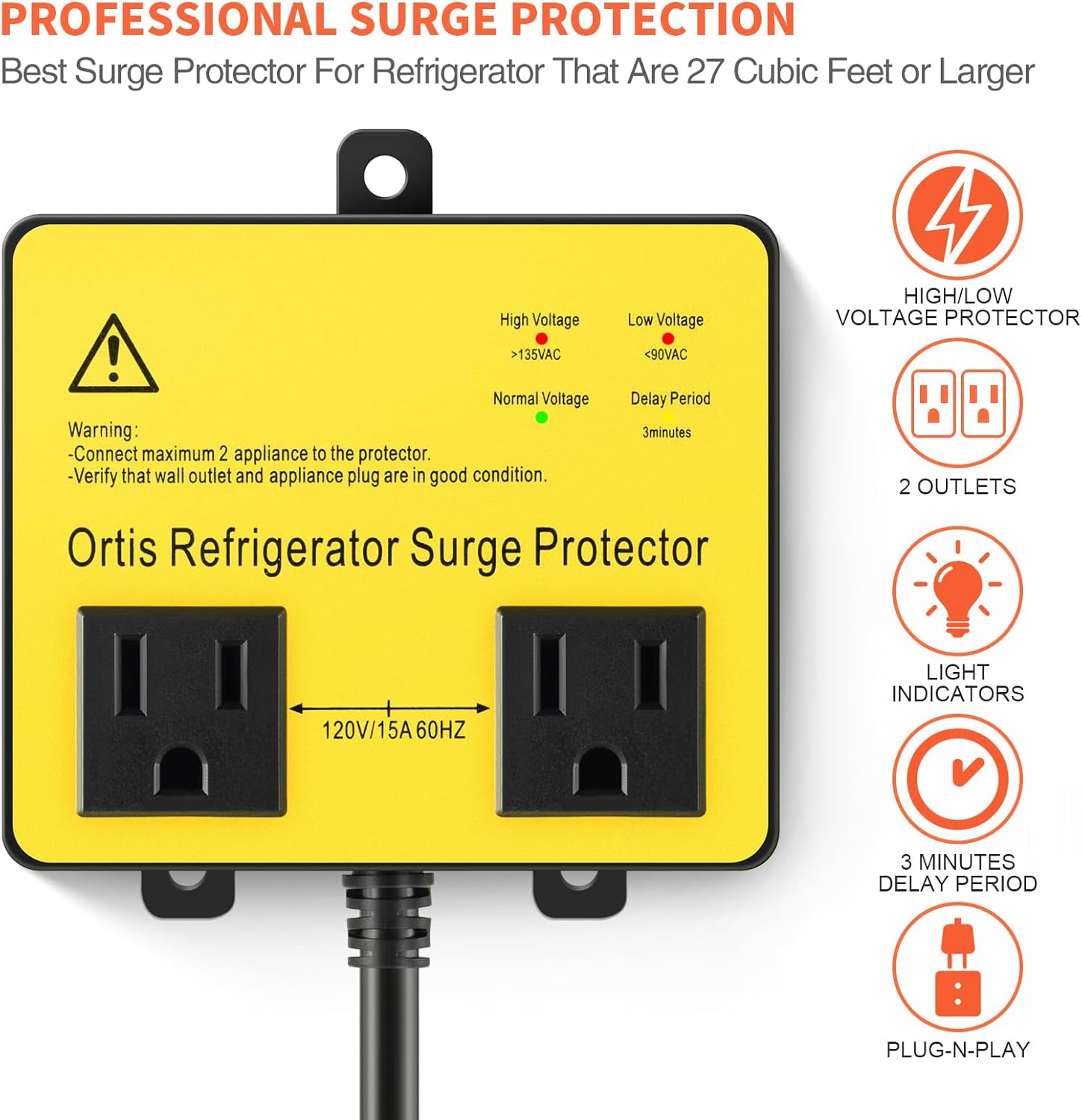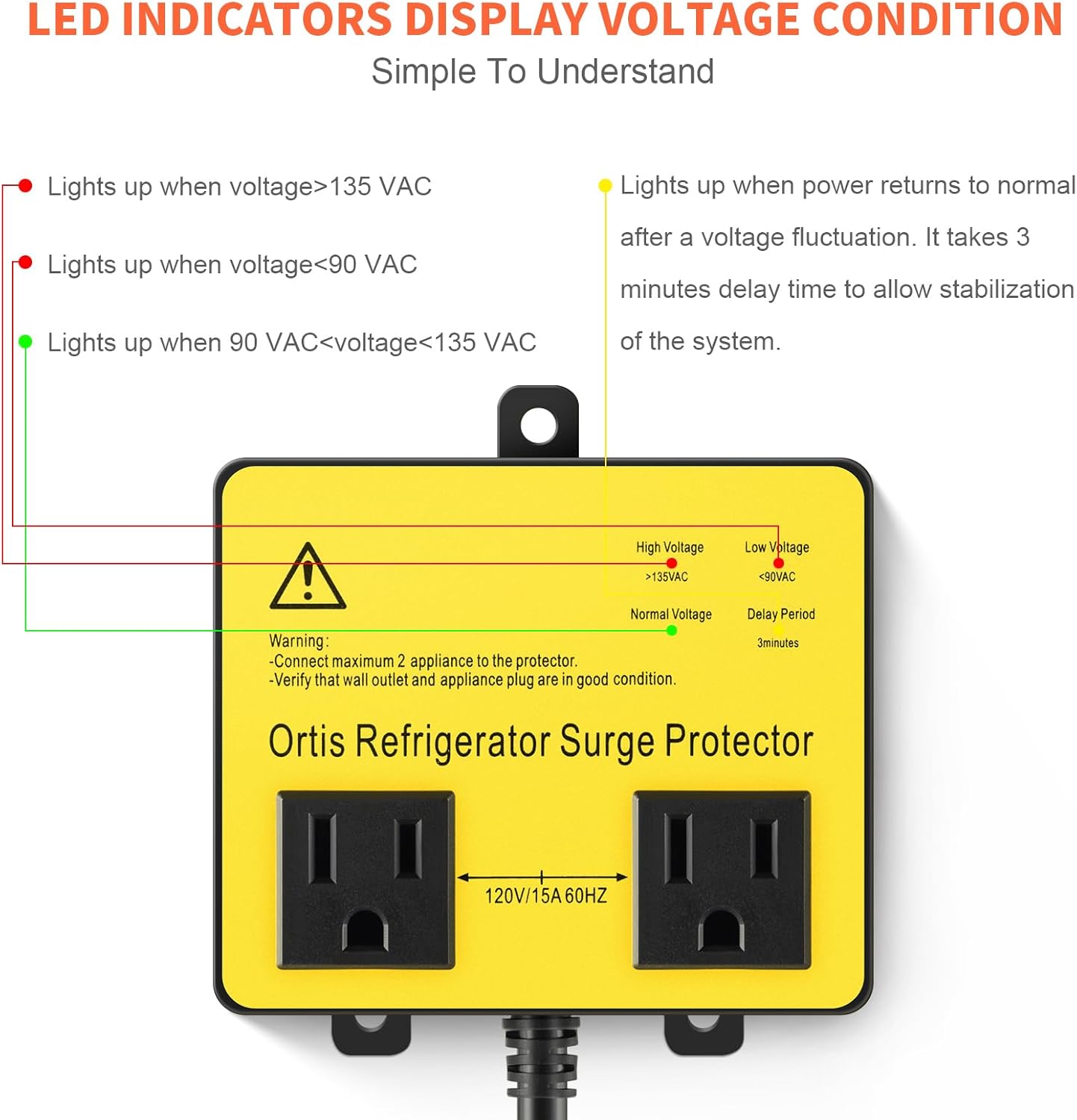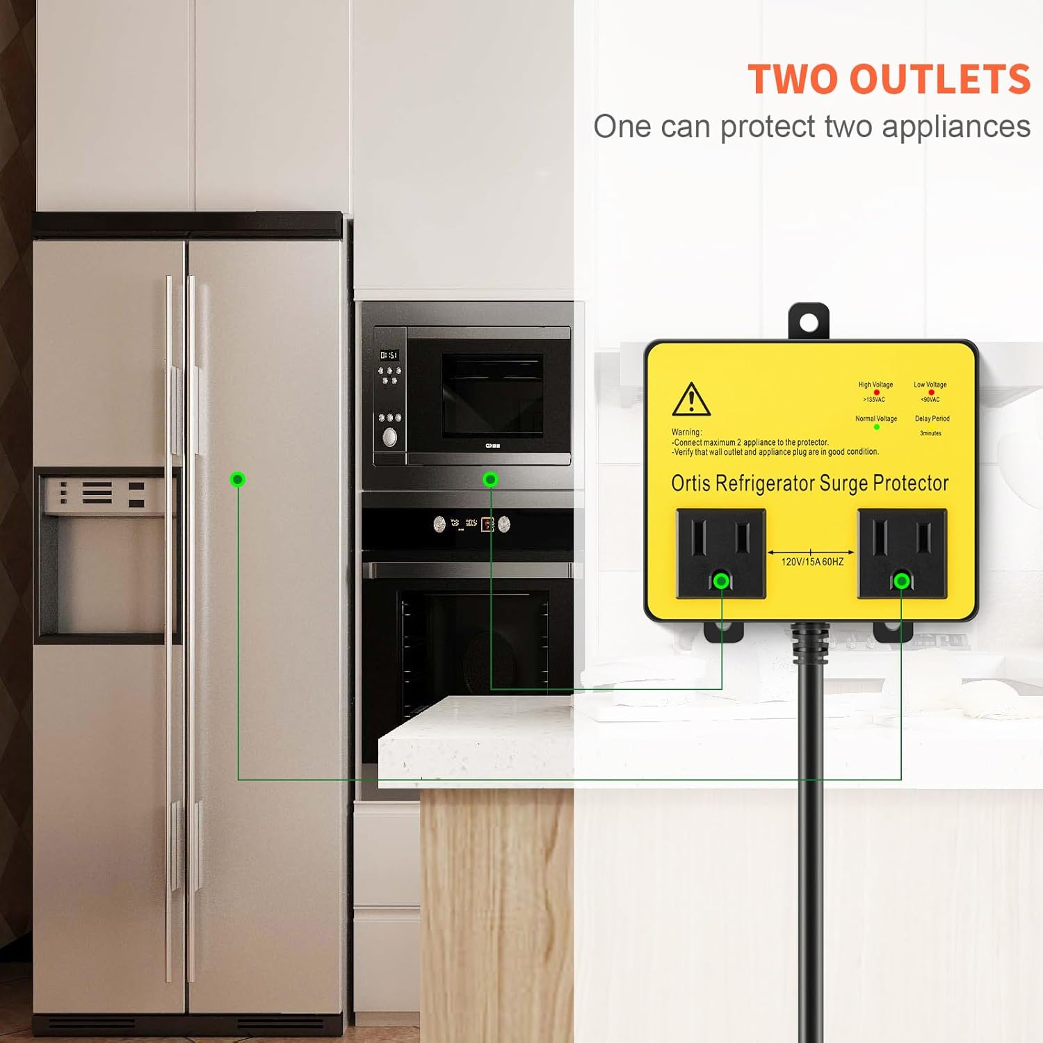 DOUBLE OUTLETS: Our surge protector offers dual outlets, allowing you to safeguard two appliances simultaneously. In addition to your refrigerator, you can easily plug in other devices like microwaves, water coolers, and dishwashers—helping you save on procurement costs