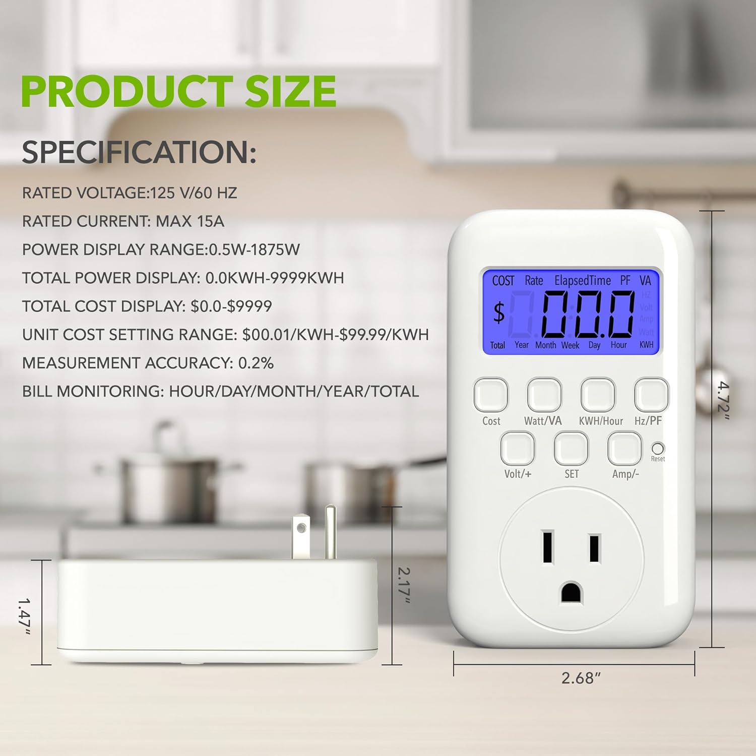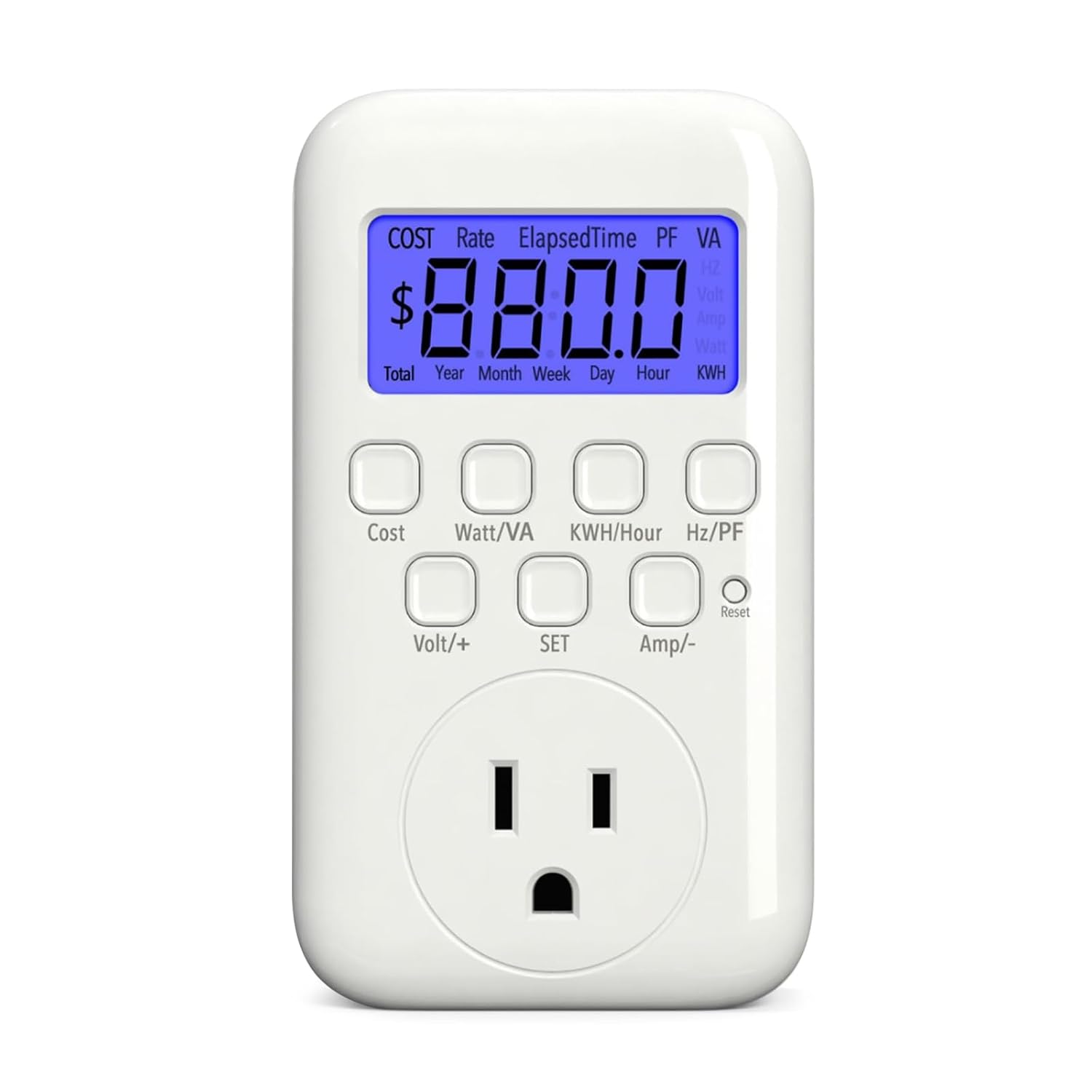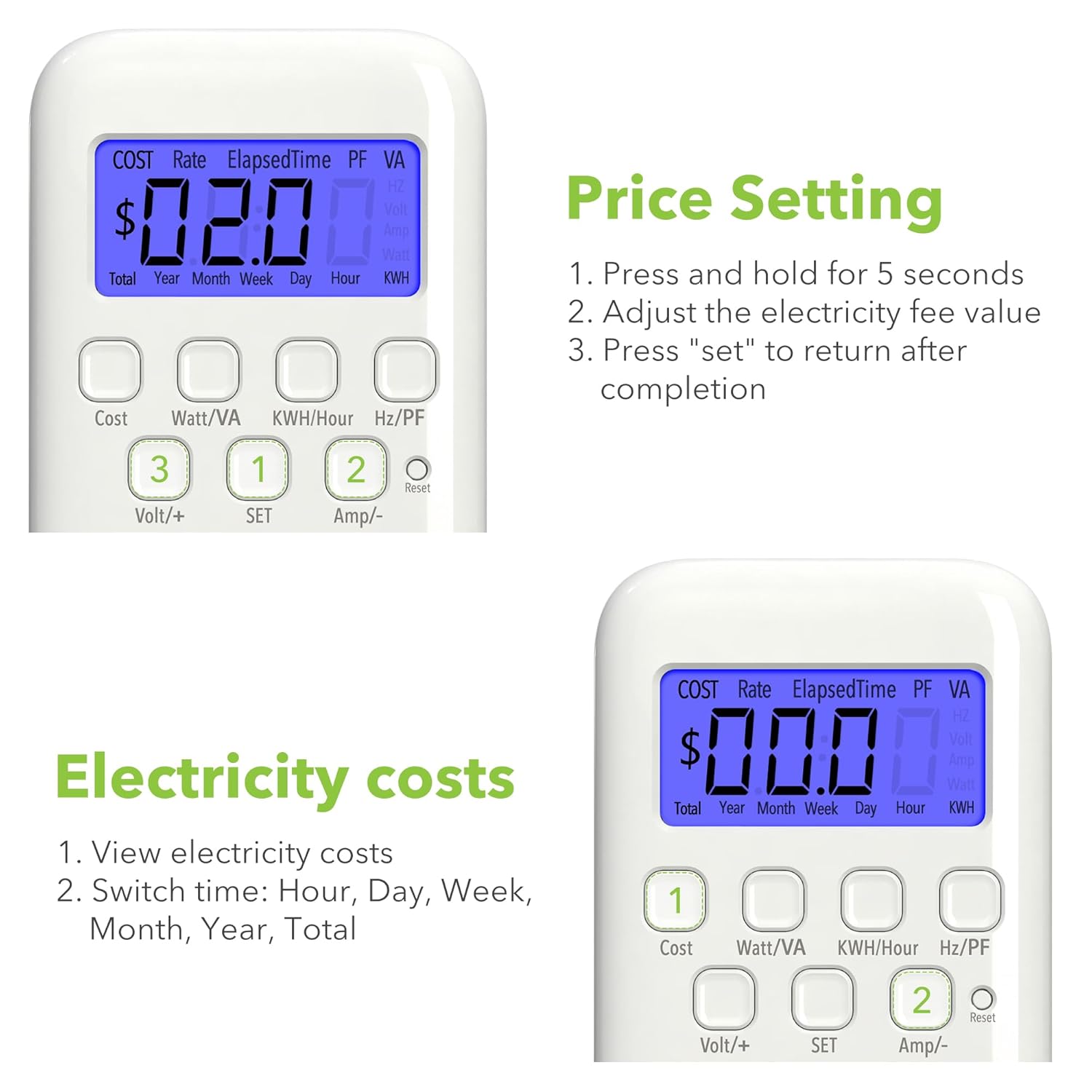 ✓ Backlit LCD Display: The watt meter features an upgraded backlit LCD display with a 160° wide viewing angle, providing clear and distinct data readings from any angle, day or night. (Note: To conserve energy, the backlight will automatically turn off after 15 seconds of continuous use.)