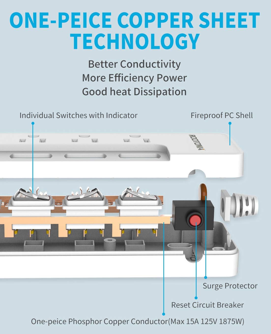 【One-Piece Copper Sheet & Fire-resistant case】This 15A/1875W/125V multi plug outlet is high-quality made with PC Fire Resisted material and the advanced One-piece 100% Copper Bar. Compared with other traditional copper conductor, it has lower heat dissipation, better conductivity and provides more efficient power and safty for all your appliances.